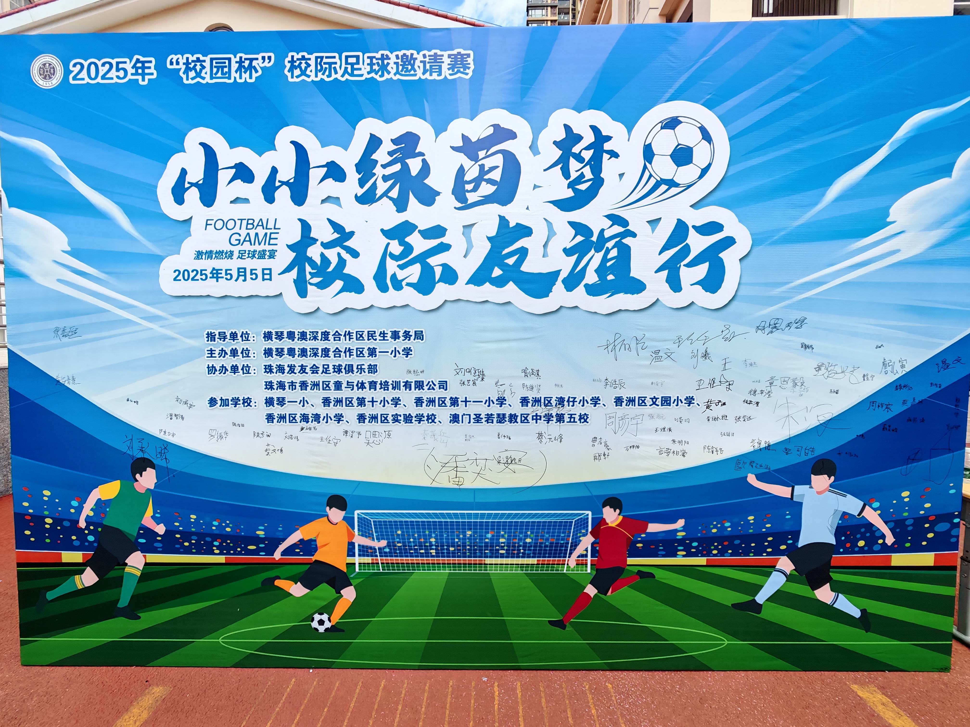 2025 橫琴「校園杯」校際足球邀請賽(小學) 2025-05-05 本校小學足球代表隊首次出征,與珠海、橫琴8所學校共10支勁旅同場競技!小將們初登賽場,奮力拼搏,最終榮獲「優異獎」,展現了頑強的鬥志與團隊精神!特別感謝教練團隊的悉心指導,家長們的全力支持,以及每一位小球員的汗水與堅持!這次比賽不僅是技術的磨練,更是成長的見證!未來可期首戰積累寶貴經驗,我們將繼續努力,在未來的賽場上再創佳績!加油!