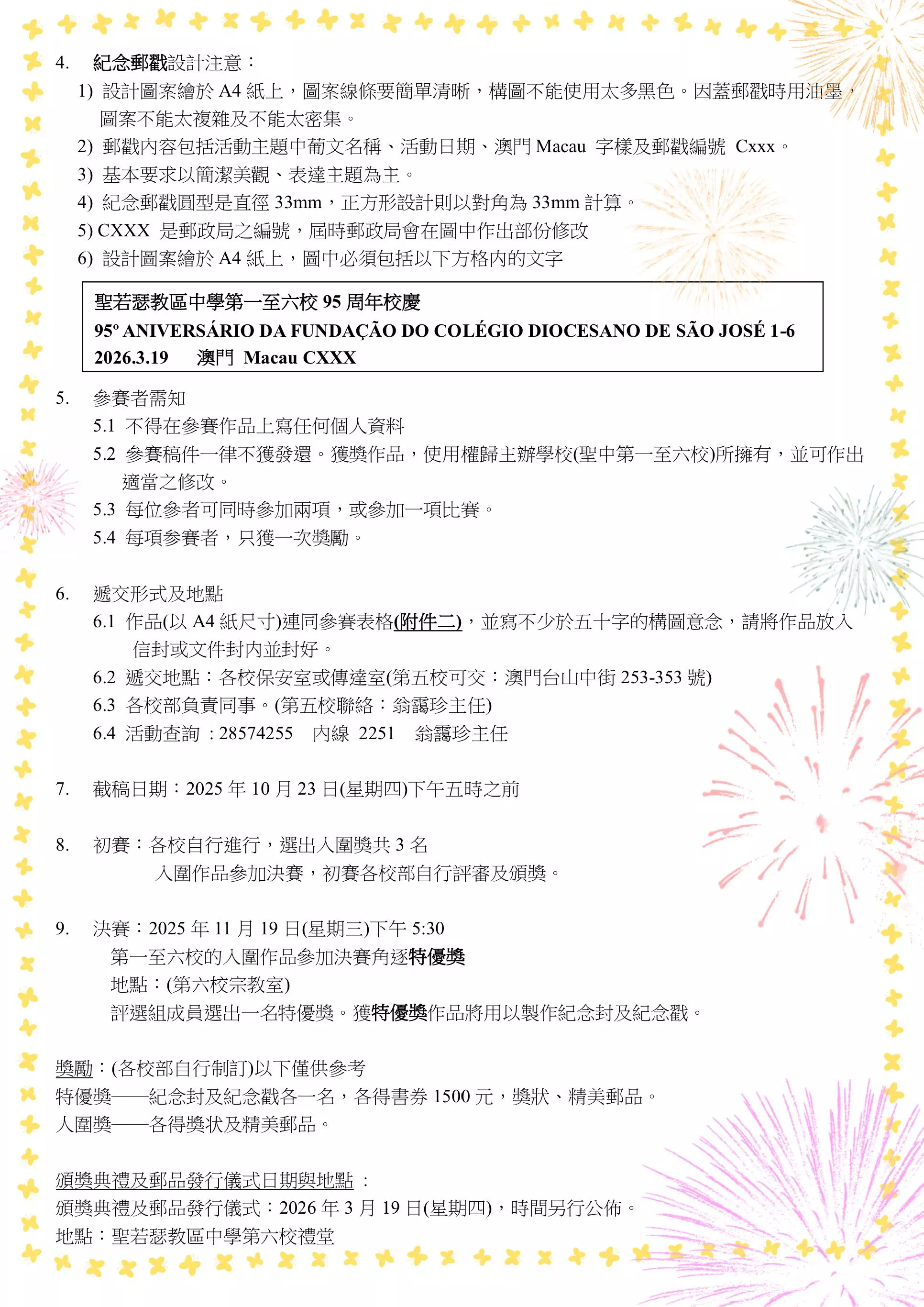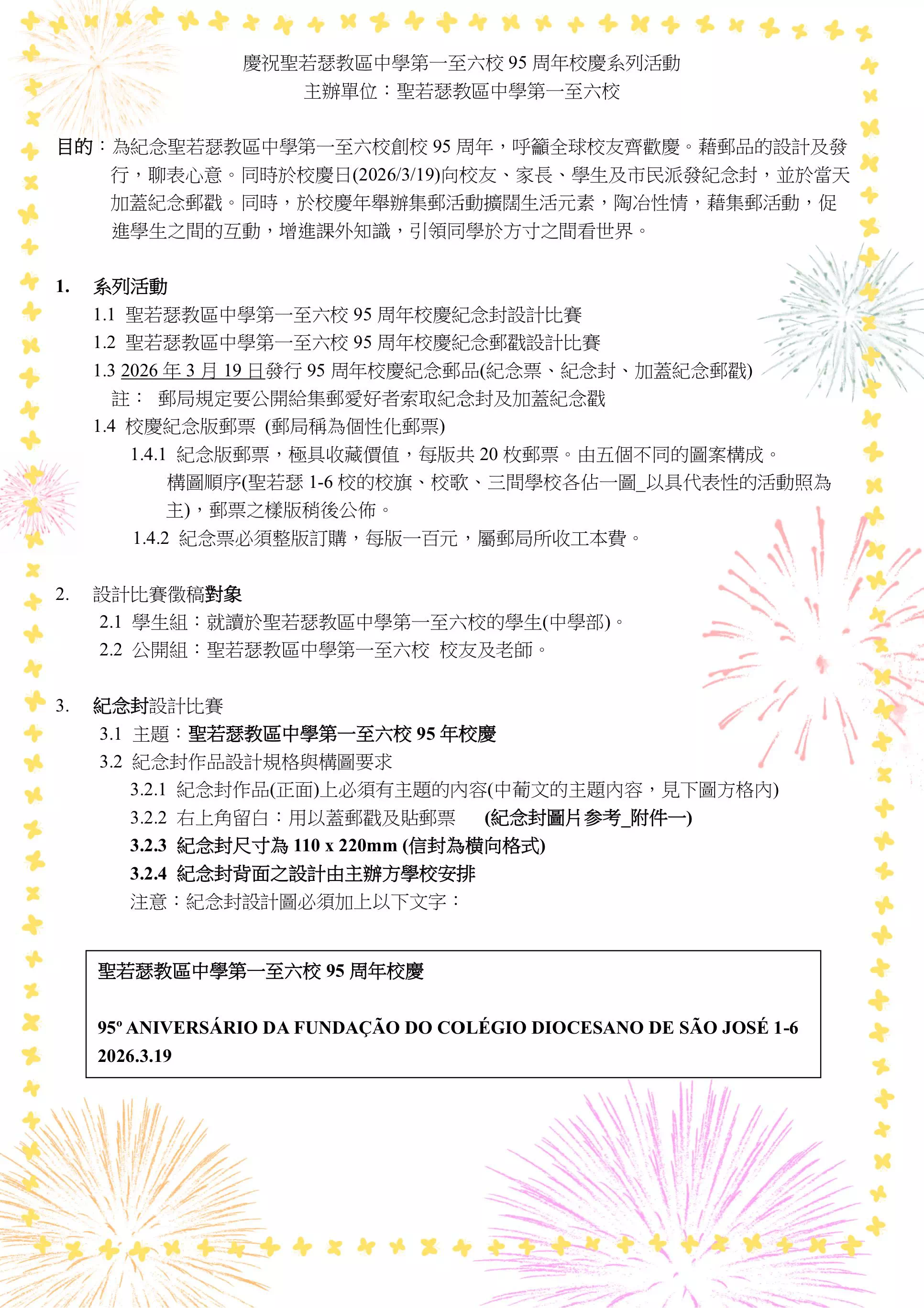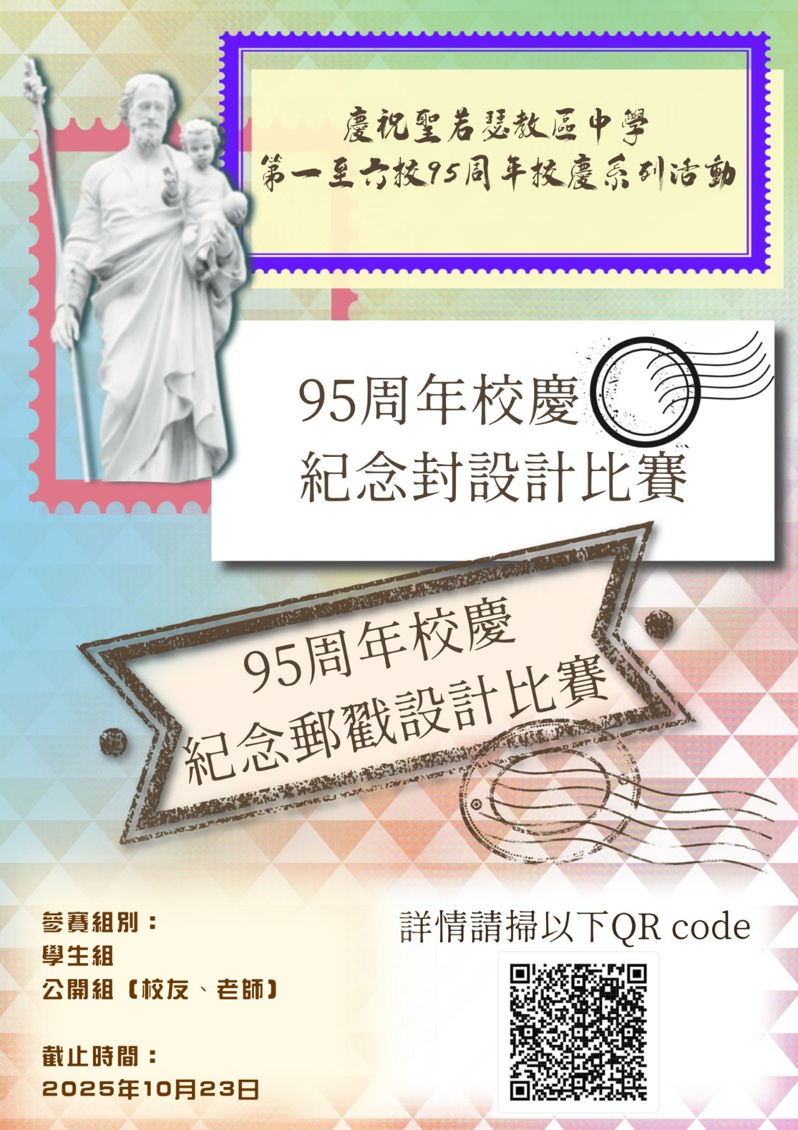 為迎接這個意義非凡的日子,學校舉辦 「紀念封設計比賽」 與 「紀念戳設計比賽」 ,一同為校慶增添獨特的藝術風采與紀念意義!無論你是設計高手還是懷抱熱情的新手,都歡迎來投件!