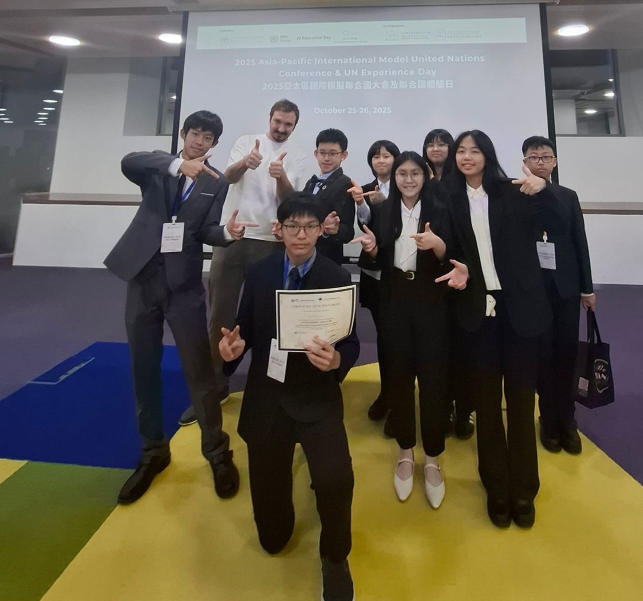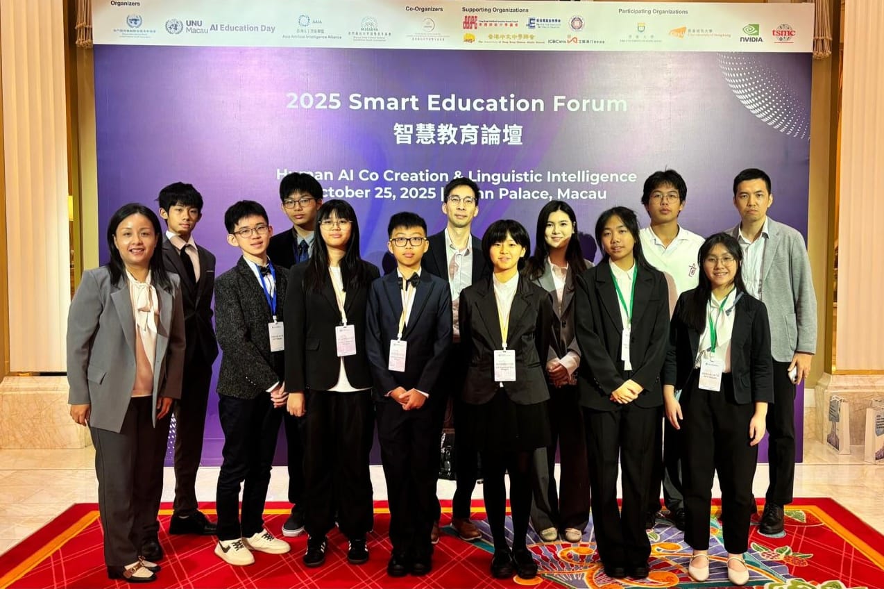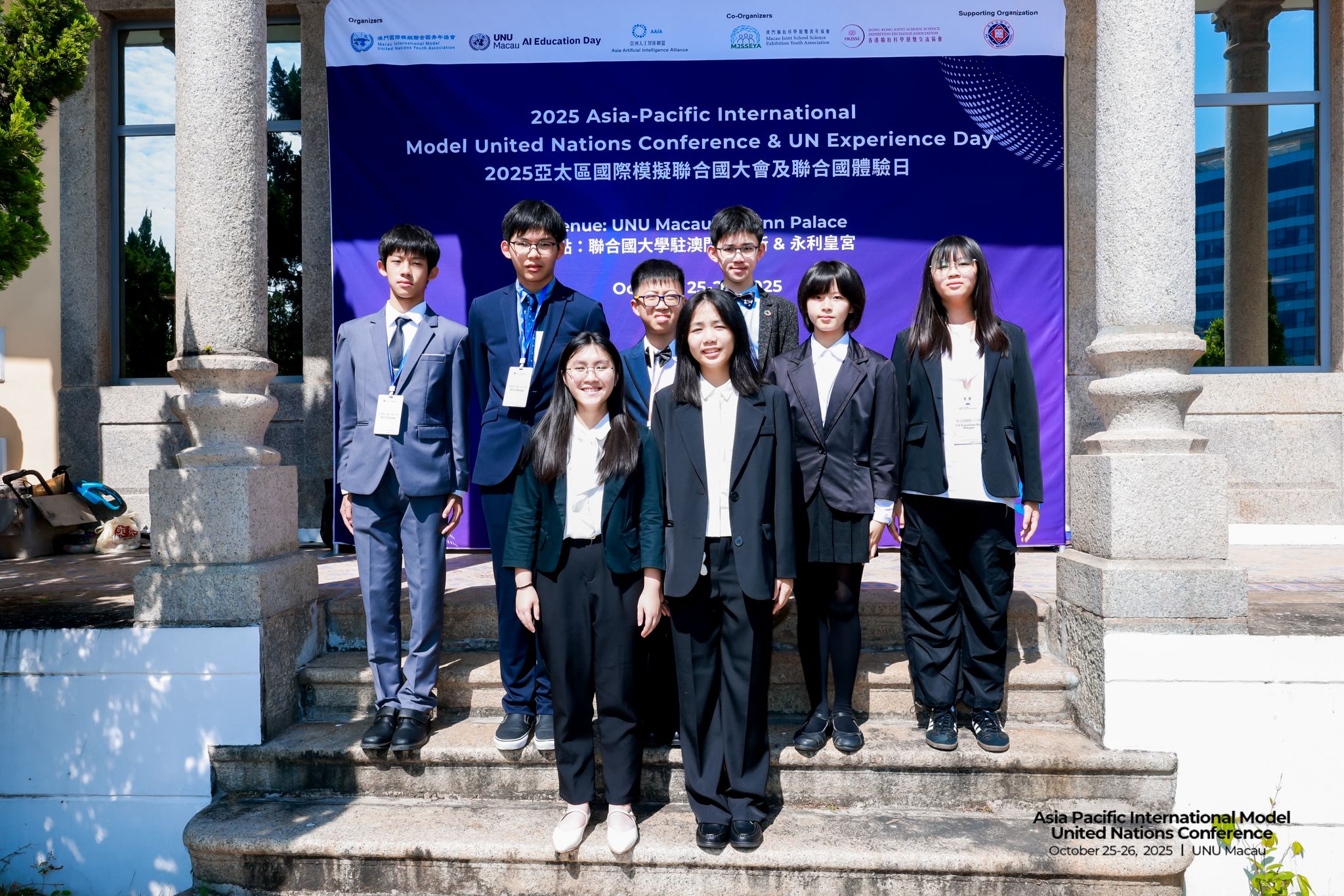 本校受邀出席於10月25日在澳門永利皇宮舉行的「2025 智慧教育論壇」,活動旨在慶祝聯合國成立80週年及聯合國大學成立50週年。副校長鄭焯基博士、中學英文部施利華主任、陳雅雯助理主任、小學英文部數學科組長張嘉麗老師,聯同八位F2–F4同學一同出席論壇及亞太區模擬聯合國大會。