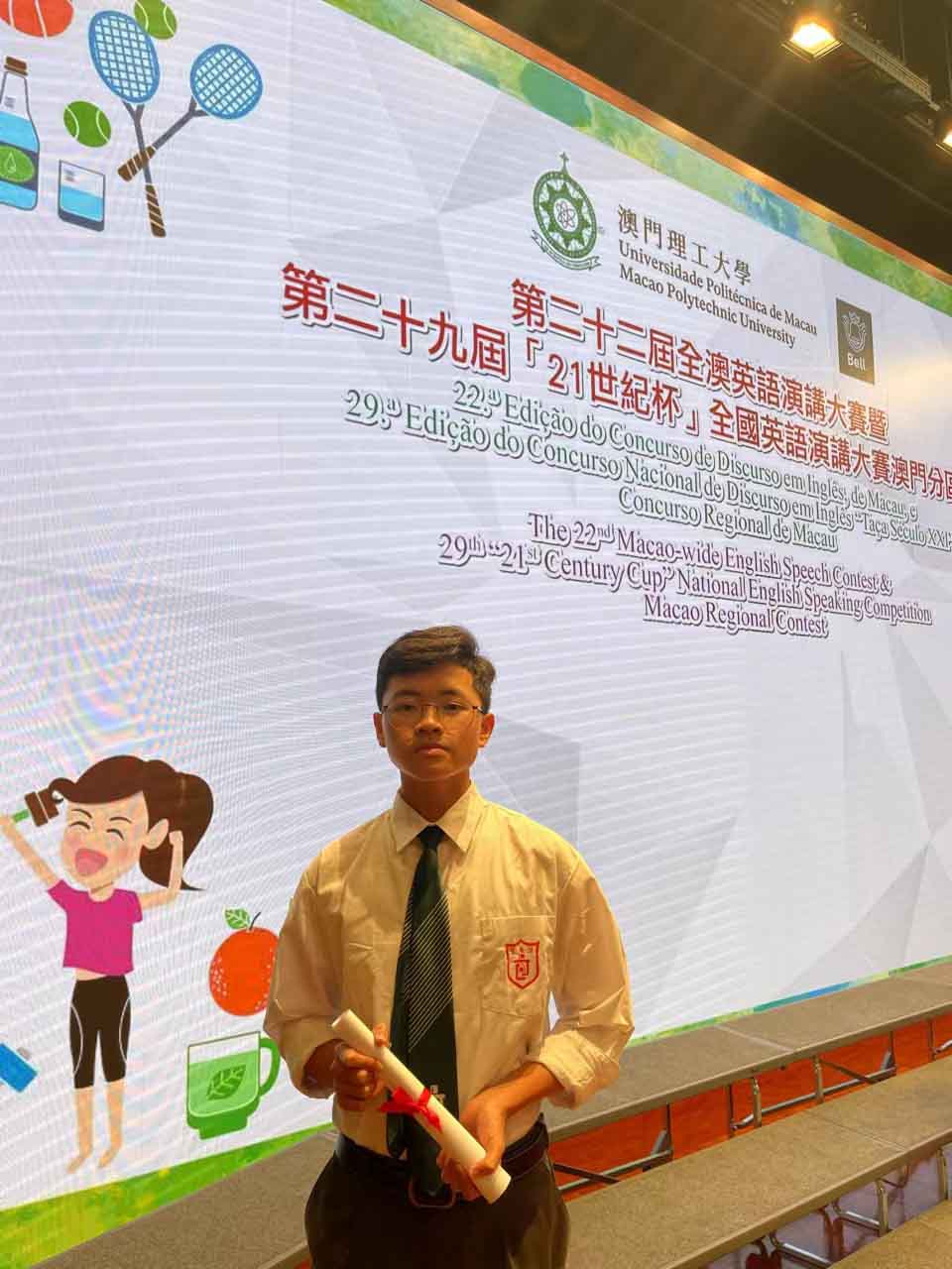 本校中學英文部的F4梁仲希同學在2023年11月25日舉行的第22屆全澳門英語演講比賽中榮獲優異獎?。梁同學的演講主題是「健康的未來」,他以深入淺出的方式進行了演講,三分鐘的準備演講有著清晰的邏輯結構,而他的二分鐘即興演講則充滿力量和說服力,他在問答環節中也表現出色。我們對梁同學的成就表示衷心祝賀,同時也感謝孫文偉老師的悉心指導。