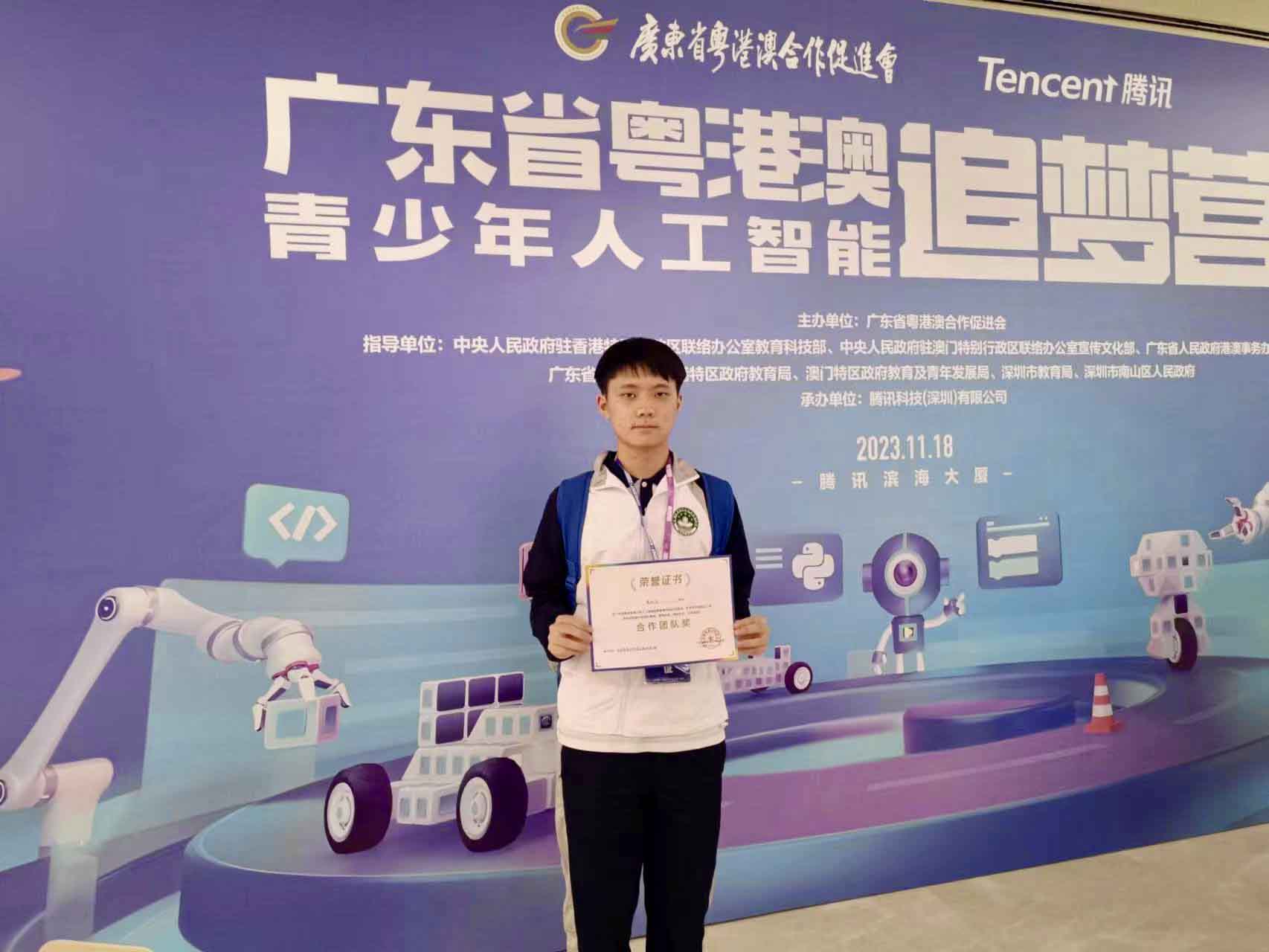 為了提升本澳學生的科學學習水平,教育及青年發展局派出本校F6黃松沛同學作為澳門學界代表隊??,參加了2023年廣東省粵港澳青少年人工智能追夢營(深圳)在騰訊總部舉行的比賽。在這次比賽中,黃松沛同學參與了虛擬仿真Python項目,面對通過Python編程控制機器人完成探索火星的任務的挑戰。最終,他取得了團隊合作獎。