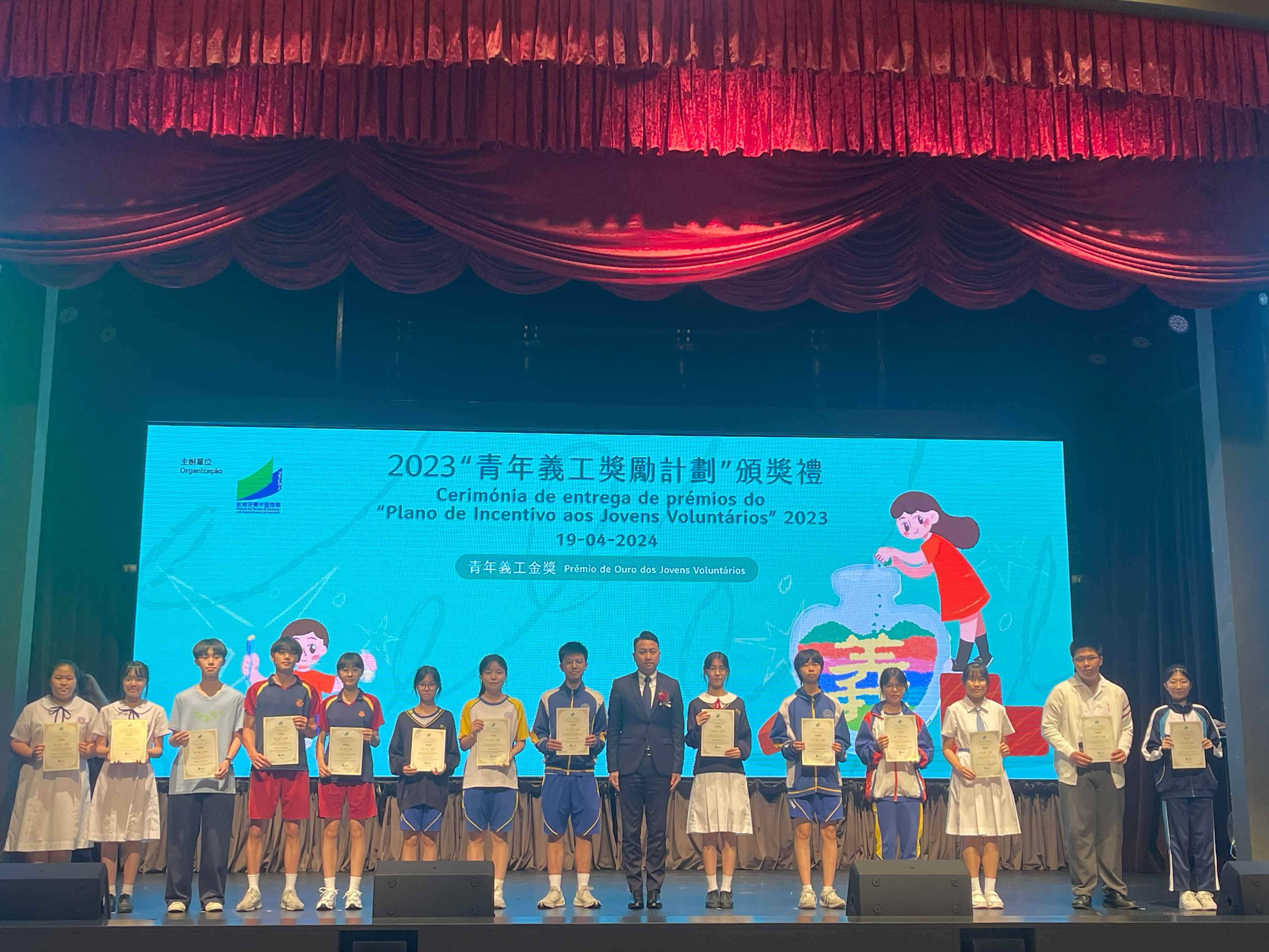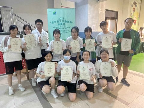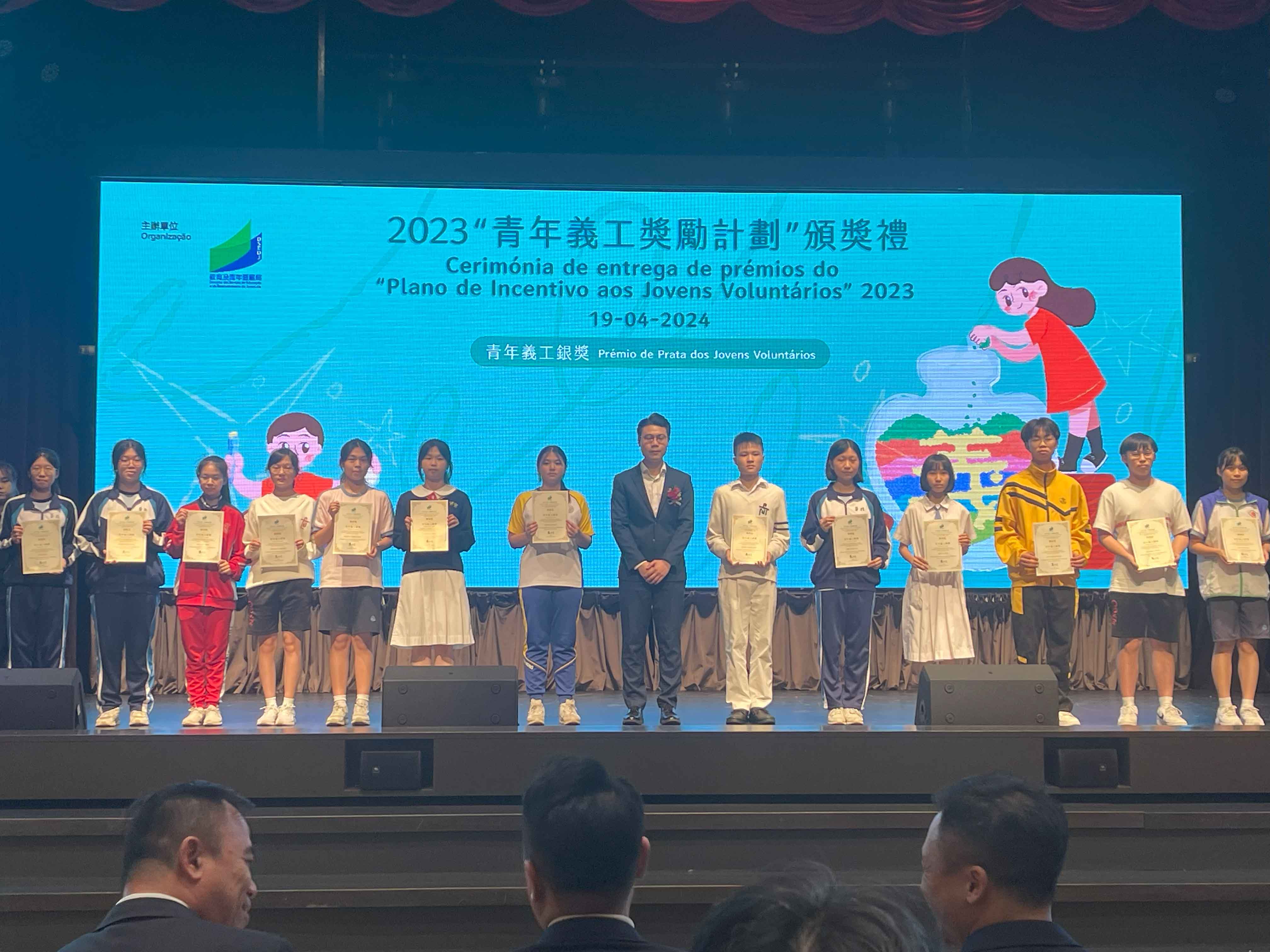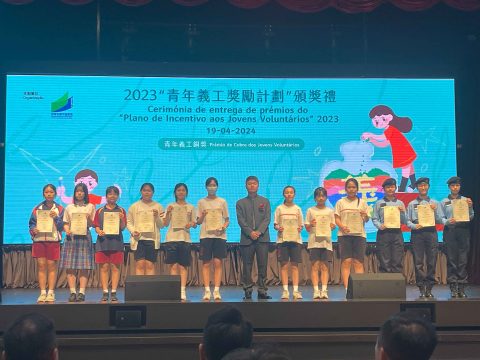 為表揚及肯定澳門青年義工,教青局舉辦2023「青年義工獎勵計劃」頒獎禮,本校共有13位同學獲得獎項,成績令人鼓舞。奬項按全年服務時數劃分為金(不少於300小時)、銀(不少於200小時)、銅(不少於100小時)獎,本校學生共獲得兩名金獎、三名銀獎及七名銅獎獎項對本校學生過去一年,在本澳社會作出的無私奉獻,給予充分肯定。