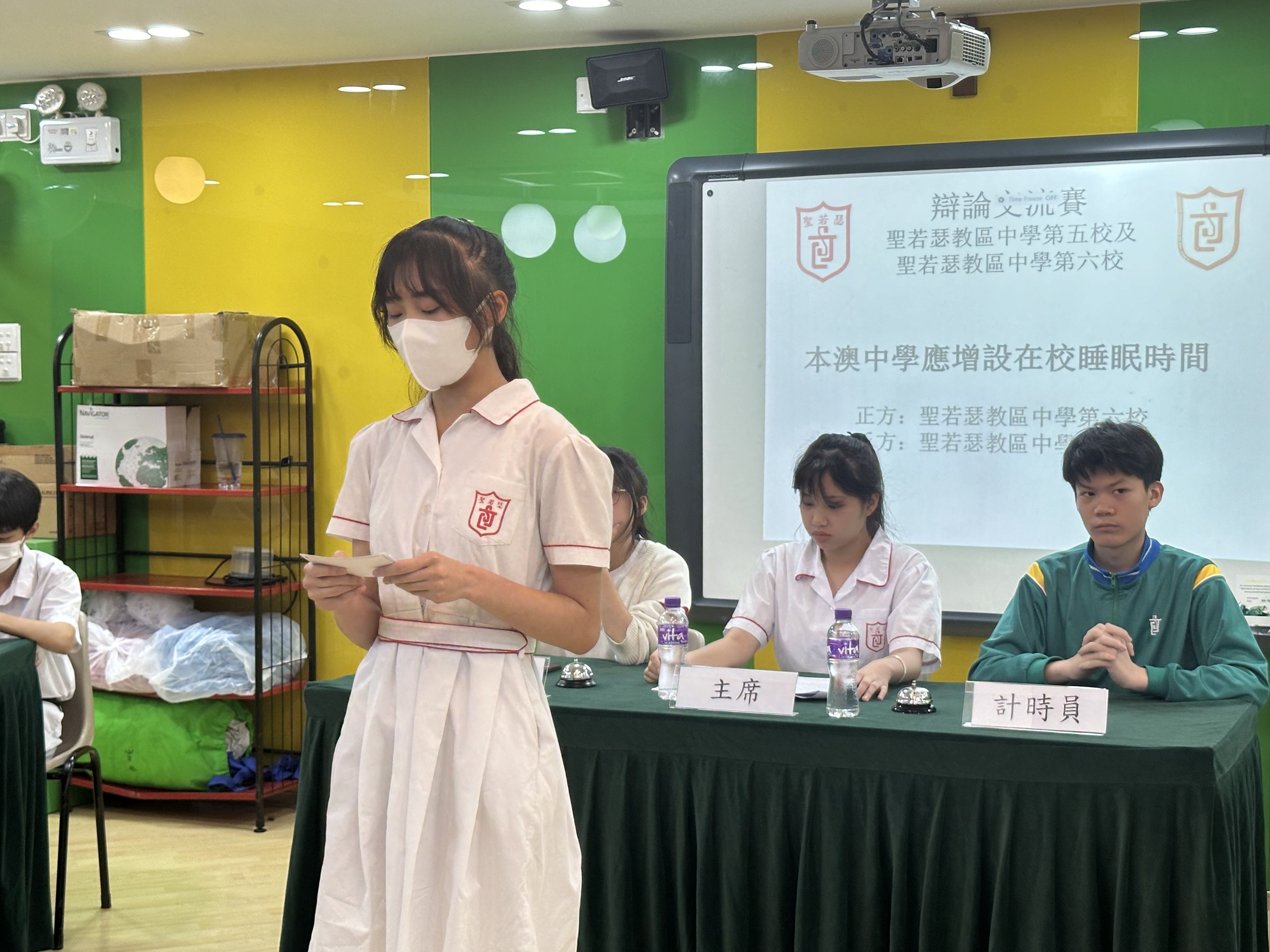 聖若瑟教區中學第五校及聖若瑟教區中學第六校辯論交流賽 2024-05-18 為促進校際交流,培養學生的批判性思維和表達能力,我校與聖若瑟教區中學第六校於本校合辦了一場精彩紛呈的辯論交流賽。兩校學生就「本澳中學應增設在校睡眠時間」這一激烈的辯題展開了激烈的論辯,雙方辯員展現了出色的邏輯分析和辯論技巧。賽後,黃允聰先生、林蒸德先生及施君悅老師對比賽進行了精彩點評和寶貴分享,相信學生們必將從中吸取養分,在未來的比賽中再接再厲,為校爭光。