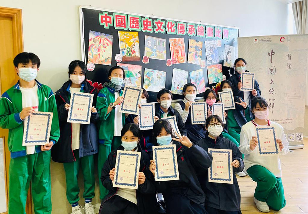 為弘揚中華文化優秀傳統,學校參加了由澳門大學中國歷史文化中心舉辦的「全城、傳承」活動。在校內舉辦了繪畫比賽,以中國歷史文化的故事或典故為主題,繪畫作品。是次活動由中文部歷史科、中文科、視藝科共同籌辦及組織,並由學生會指導老師擔任評分。獲奬同學可以得到由澳門大學中國歷史文化中心頒發的證書。得獎同學如下: