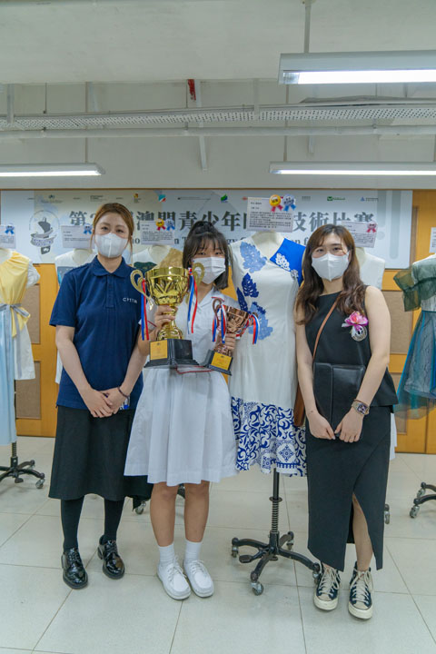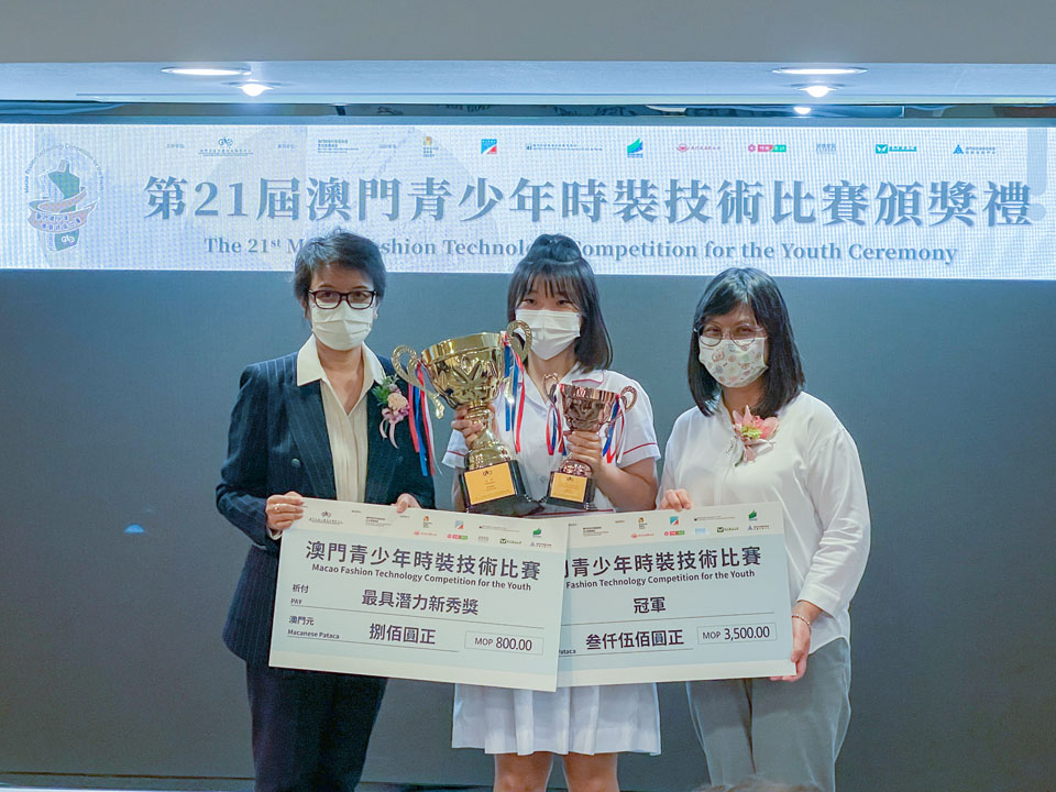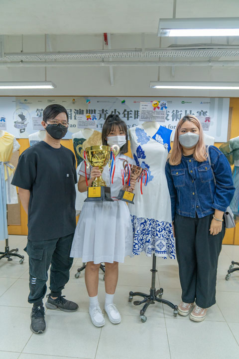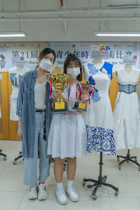 第二十一屆澳門青少年時裝技術比賽 2022-11-18 本校學生參加了由澳門生產力暨科技轉移中心主辨的「第二十一屆澳門青少年時裝技術比賽」,在限時內完成指定款式的上衣製作,並以「澳城歷遊」為主題為服裝加上創意設計。 而本校F.5 戴慧琪同學在是次比賽中榮獲冠軍及最具潛力新秀獎! 她設計的服裝名為「共存」,以簡單的旗袍款式配以帶有葡式瓷磚圖案的布料,表達在澳門中葡交融的特式。