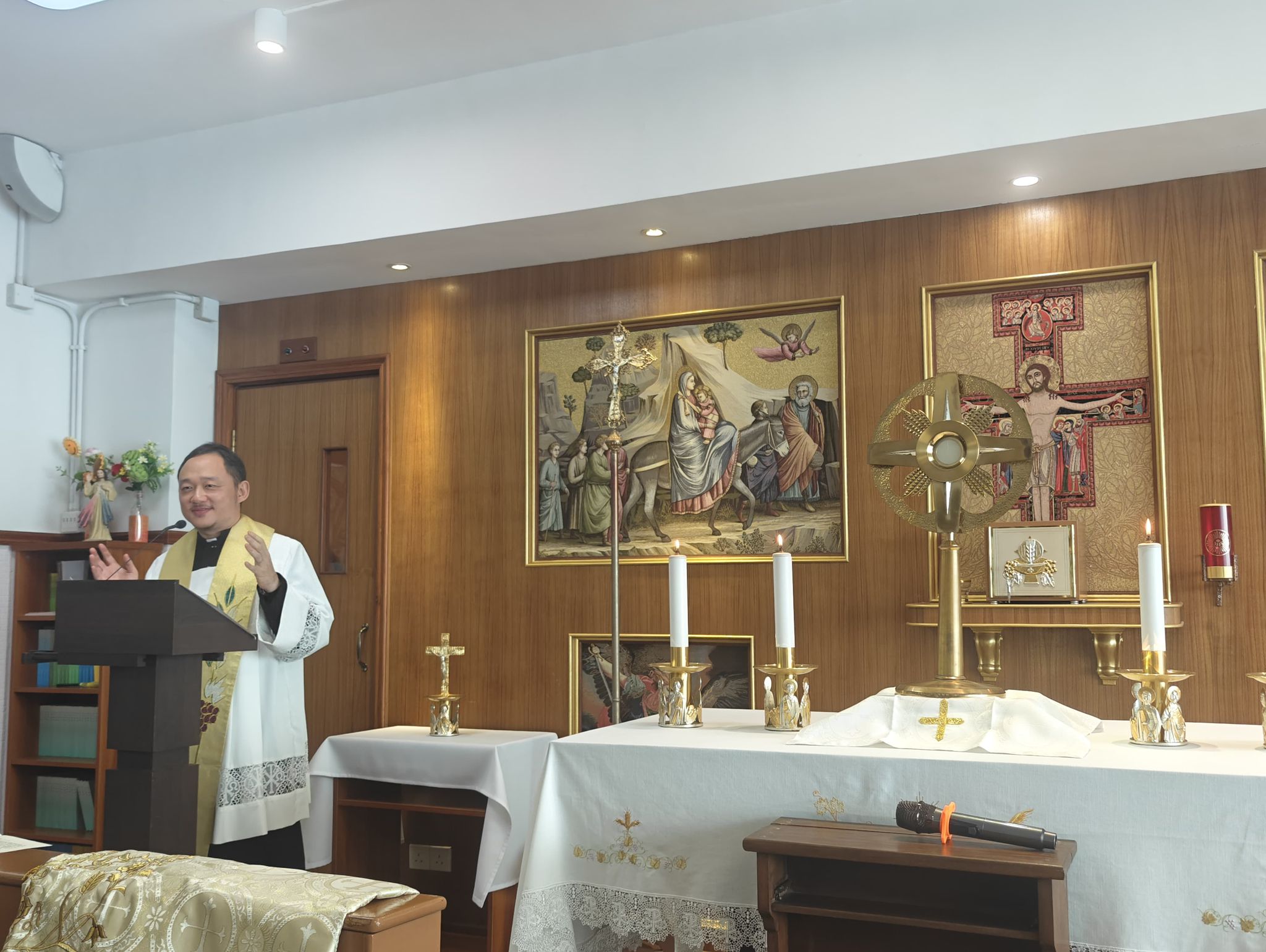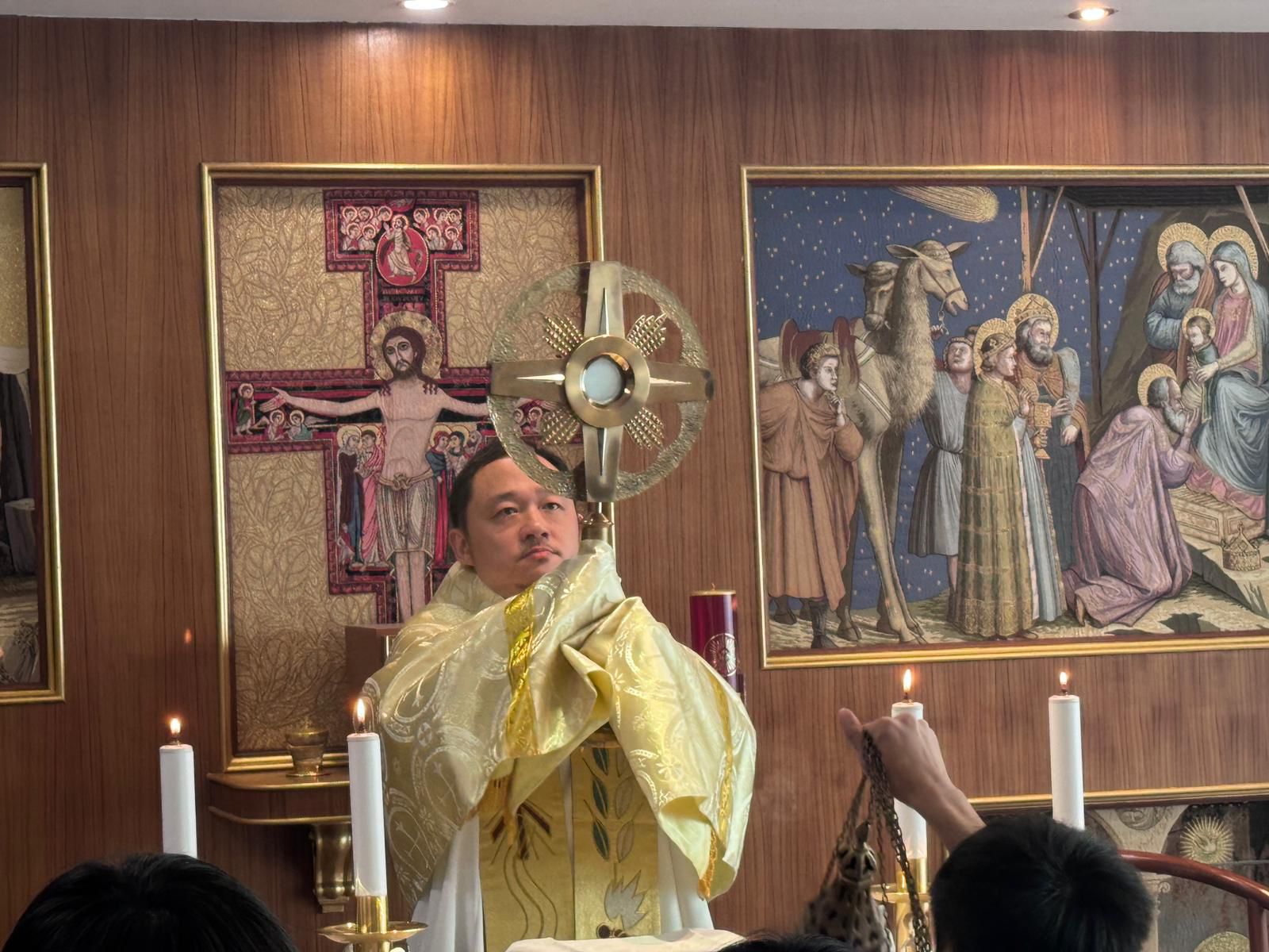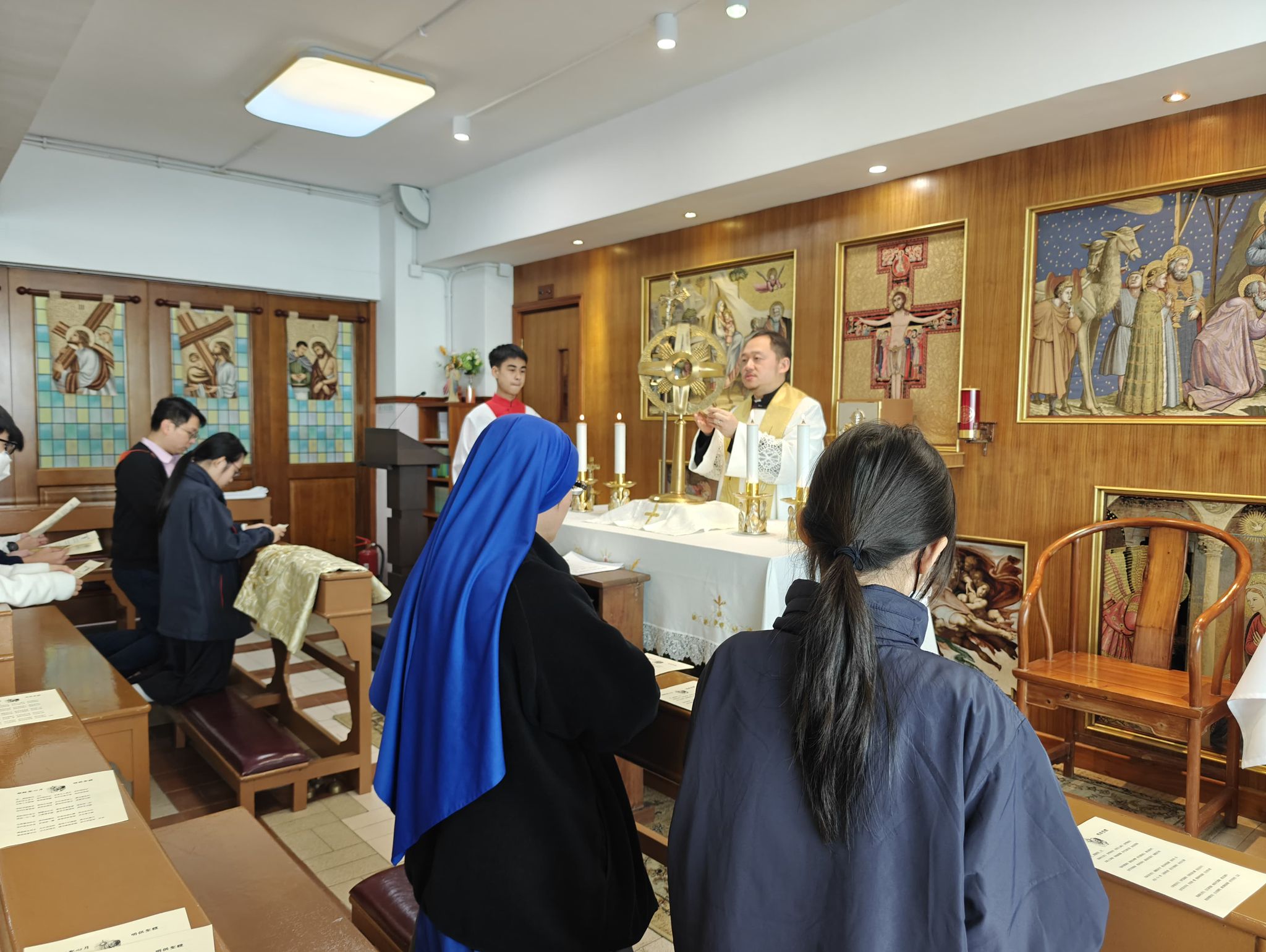 1月15日中午,校牧張俊鍵神父、眷顧修女與中學天主教同學會的同學齊聚於校內小聖堂進行聖體朝拜。張神父首先帶領眾人默想,並在恭讀福音後分享,提醒大家:祈禱應靜心聆聽天主的旨意,求主指引我們明確的方向。隨後,同學們一同誦念慈悲串經,懇求天主賜予耐心與智慧,使眾人明瞭盡心求學是本分,並能以平安的心與清晰的思緒面對各種挑戰。最後,全體在神父的帶領下領受聖體降福,為此次聚會畫下句點。