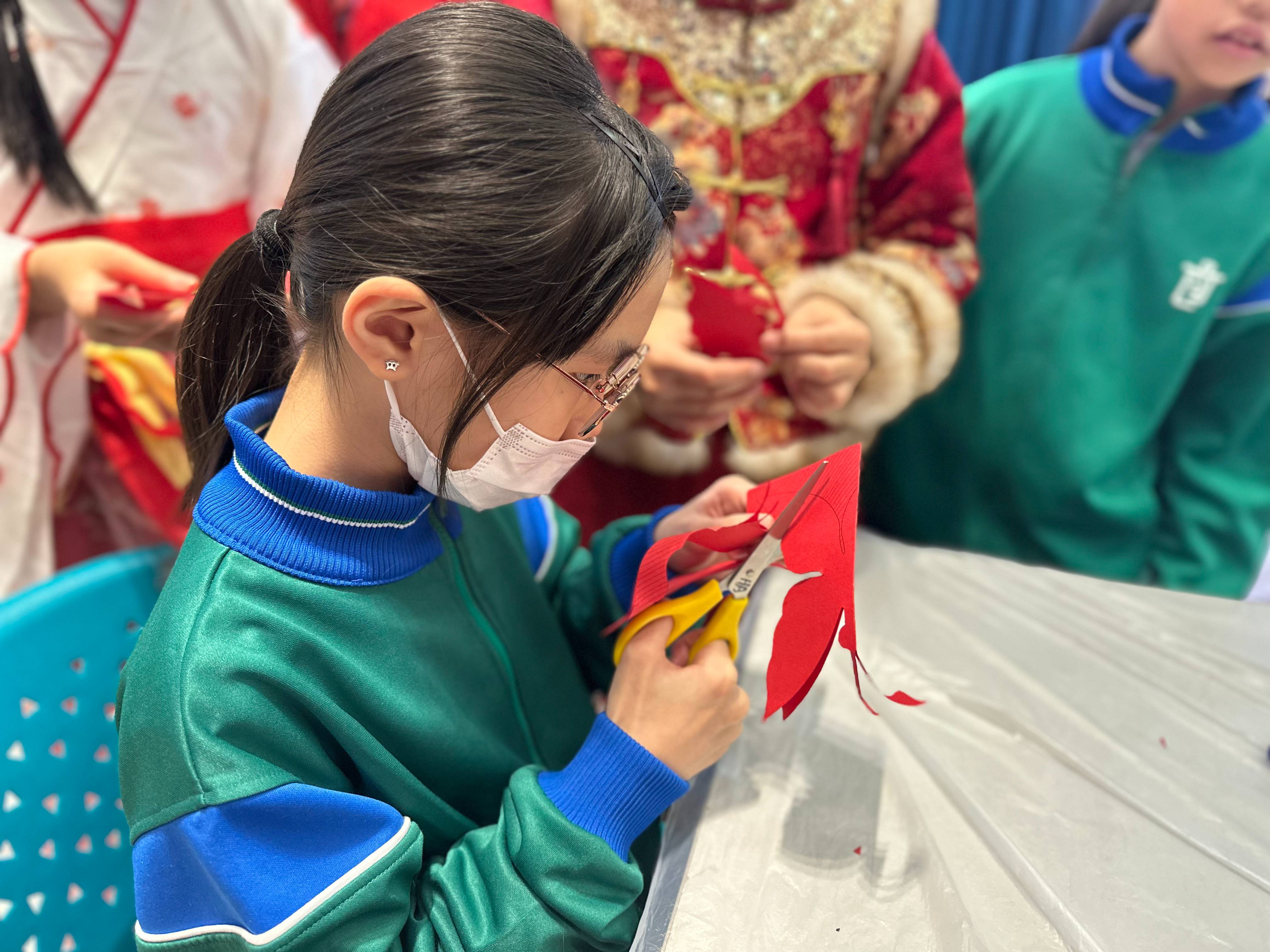 攤位遊戲同樣熱鬧非凡,除了感受古代服裝的文化,還有書法體驗、臉譜繪製、剪紙等,以及認識中國傳統習俗及民間小玩意等攤位,同學們絡繹不絕、踴躍參與。