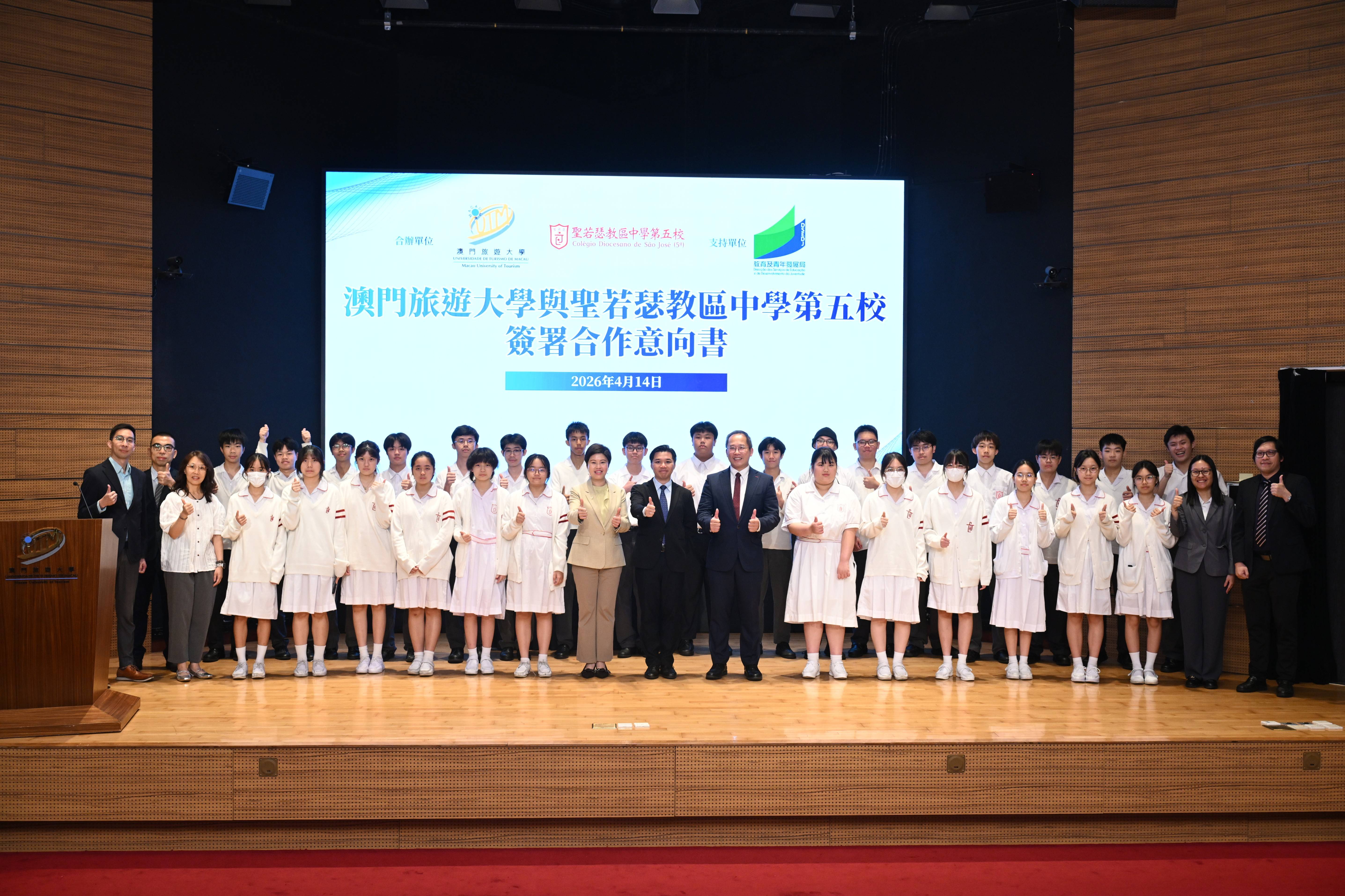 為響應澳門特區政府職業教育發展號召,推動基礎與高等教育深度融合,培育契合澳門經濟多元發展的優秀人才,我校於 4 月 14 日在教育及青年發展局支持下,與澳門旅遊大學正式簽訂高中職業教育課程合作意向書。教育局副局長丁少雄、黃嘉祺,澳門旅遊大學校長黃竹君,以及我校師生、嘉賓代表蒞臨現場,共同見證這一重要時刻。