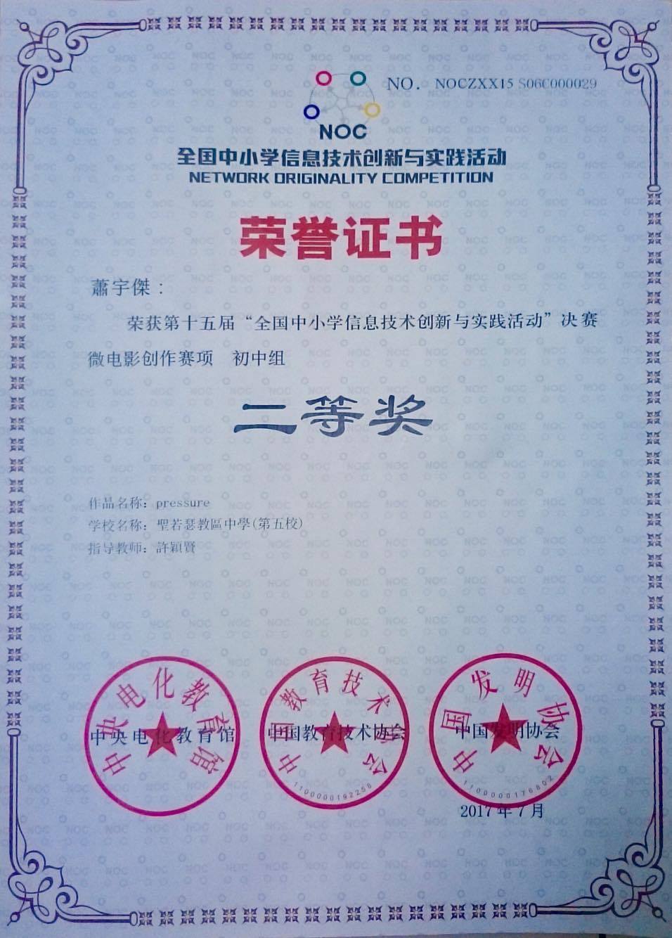 由教育暨青年局組織的澳門學界代表隊,於2017年7月14日至18日期間前往山東省青島市參加“第十五屆全國中小學信息技術創新與實踐活動"決賽及表彰大會,我校學生蕭宇傑於初中組微電影創作競賽獲得二等獎