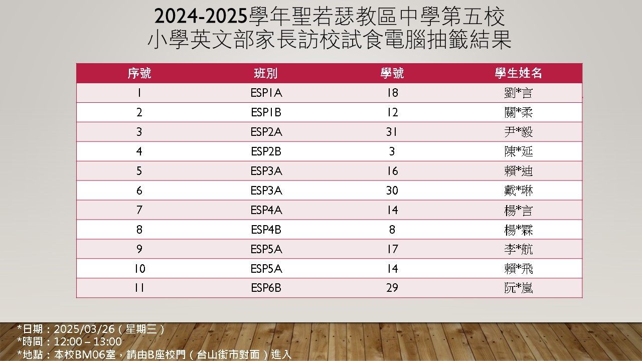2024-2025學年小學英文部家長訪校試食電腦抽籤結果