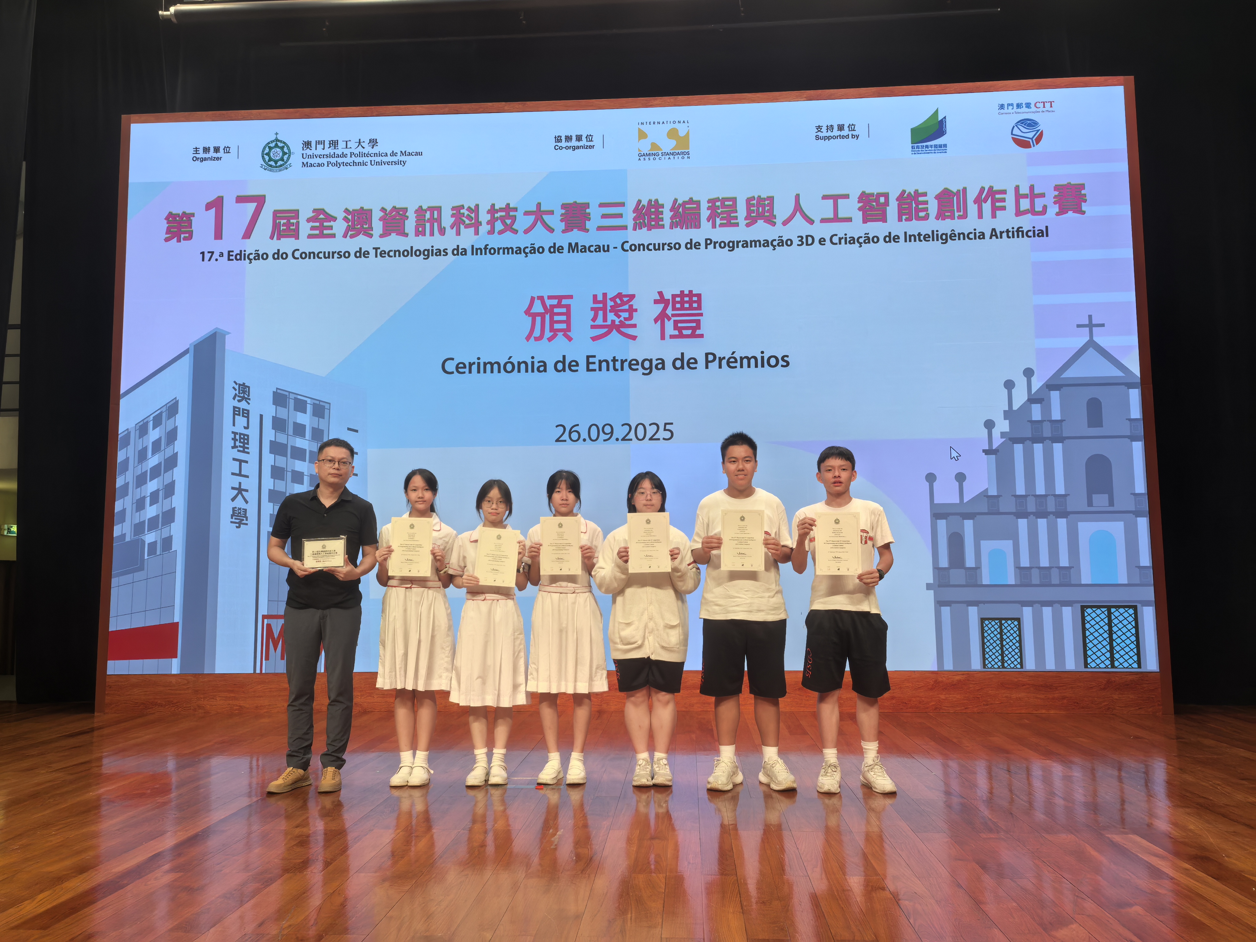 本校組織了同學參加澳門理工大學主辦的“第十七屆全澳資訊科技大賽 – 三維編程與人工智能創作比賽” 在國際博彩標準協會(iGSA)的協辦、澳門特別行政區政府教育及青年發展局和郵電局的支持下順利舉行。是次比賽的主要目的是推動本澳居民對資訊科技及人工智能的應用,配合特區政府“1+4”經濟適度多元發展策略,培育跨領域的高新技術人才,從而促進資訊科技及人工智能在澳門的發展,提高澳門高新技術人才儲備。大賽競爭激烈,全澳有500多名學生參與比賽,恭喜同學們獲得優異的成績。