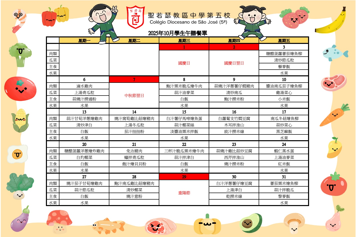 2025年10月份學生午膳餐單