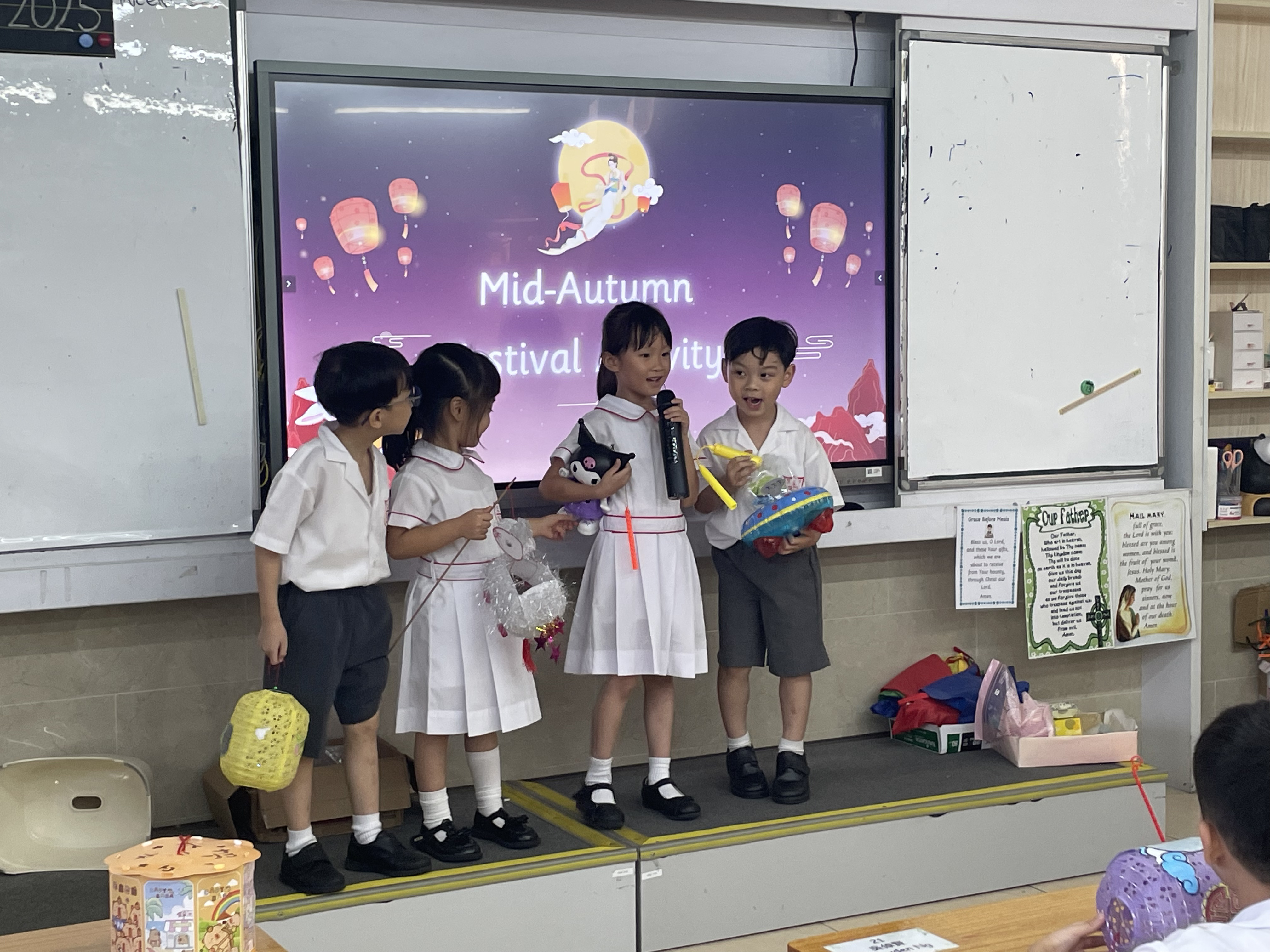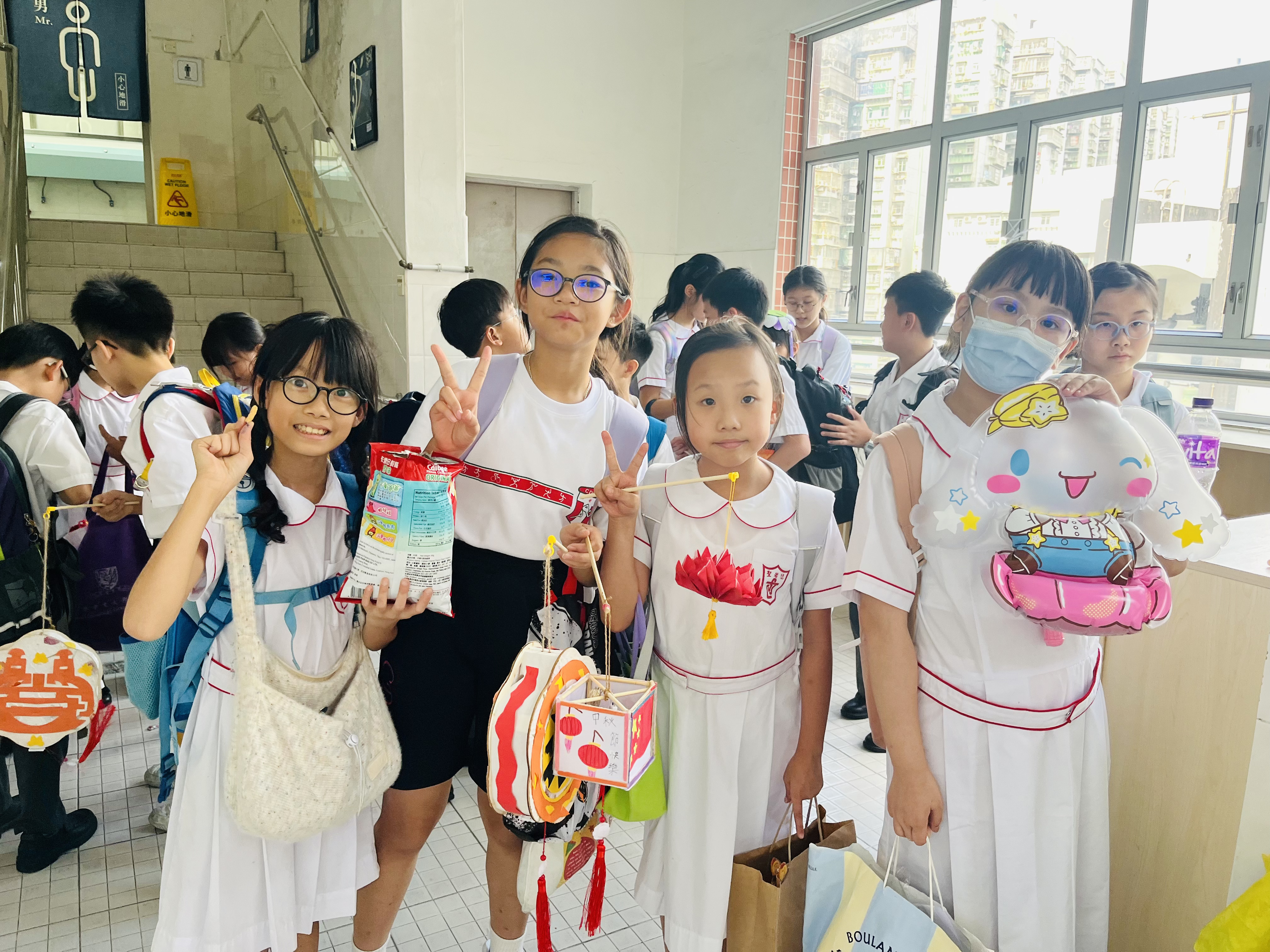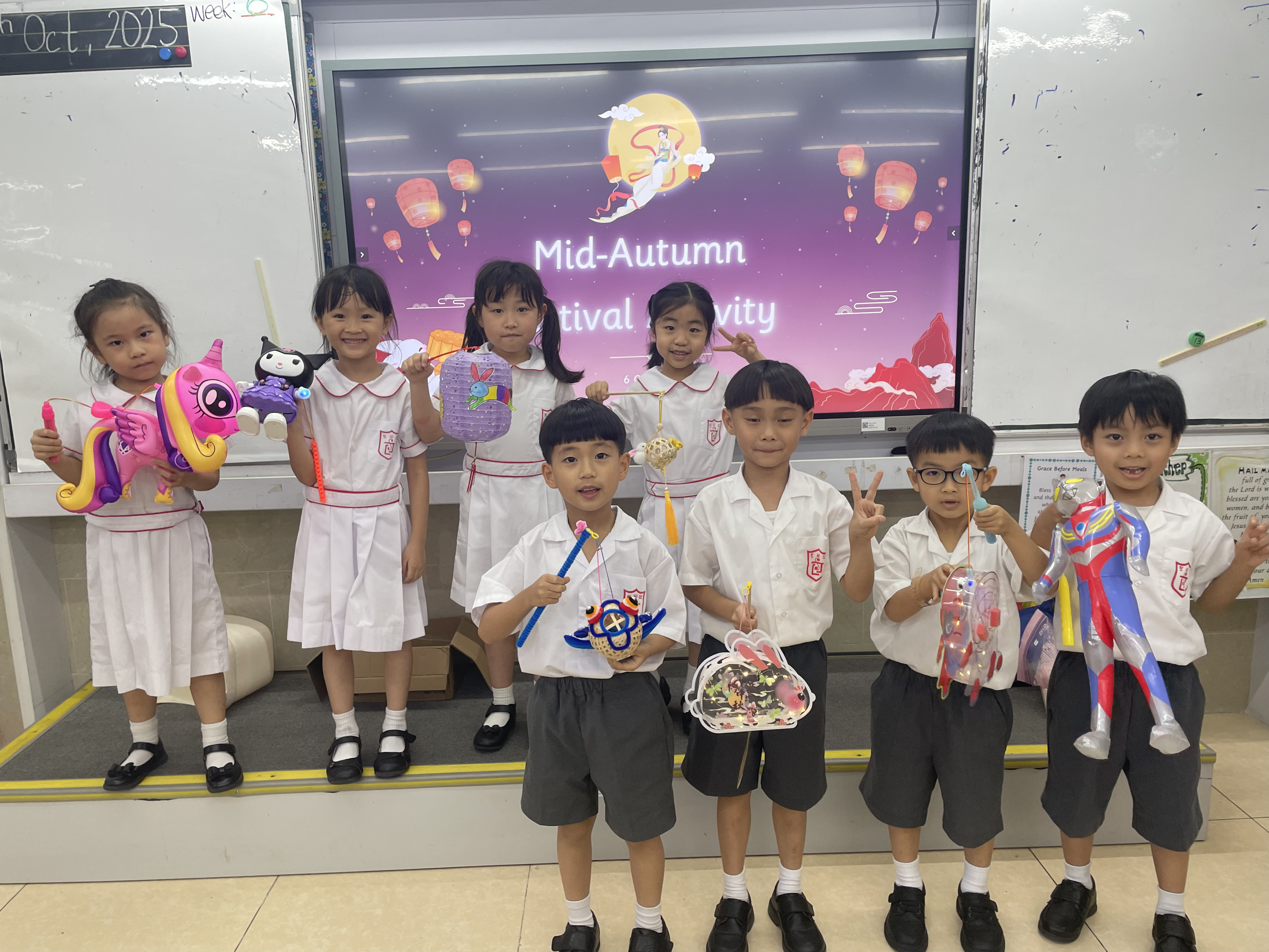 中秋節當天,P1-P3 在課室聽中秋故事、一同品嚐月餅與應節小食,互玩燈籠、合影留念,笑聲不斷;P4-P6 則以中文及英文燈謎互動切磋,猜中即可獲得同學精心準備的小禮物。同學們在歡樂中感受中華傳統文化,收穫難忘與充實!