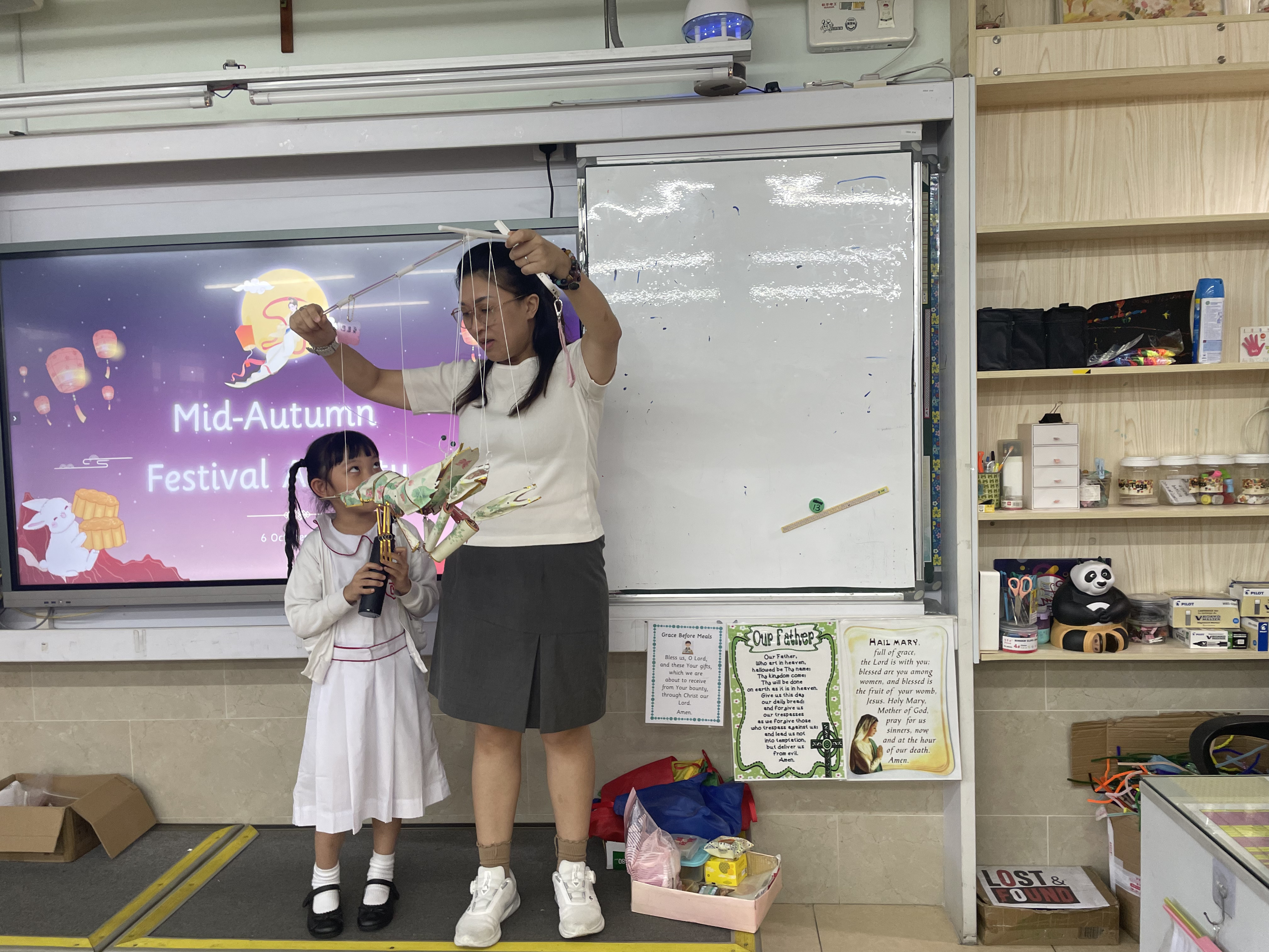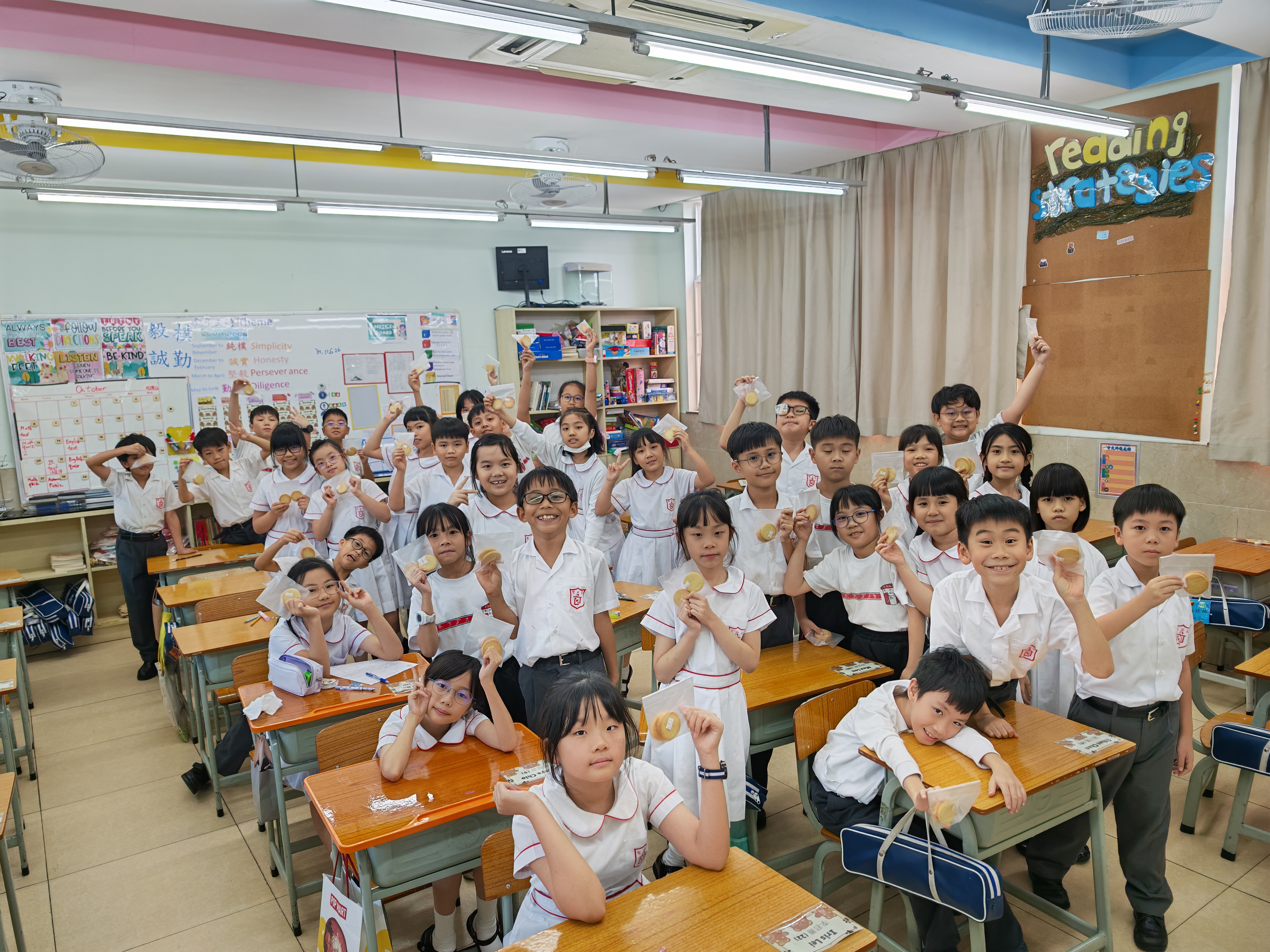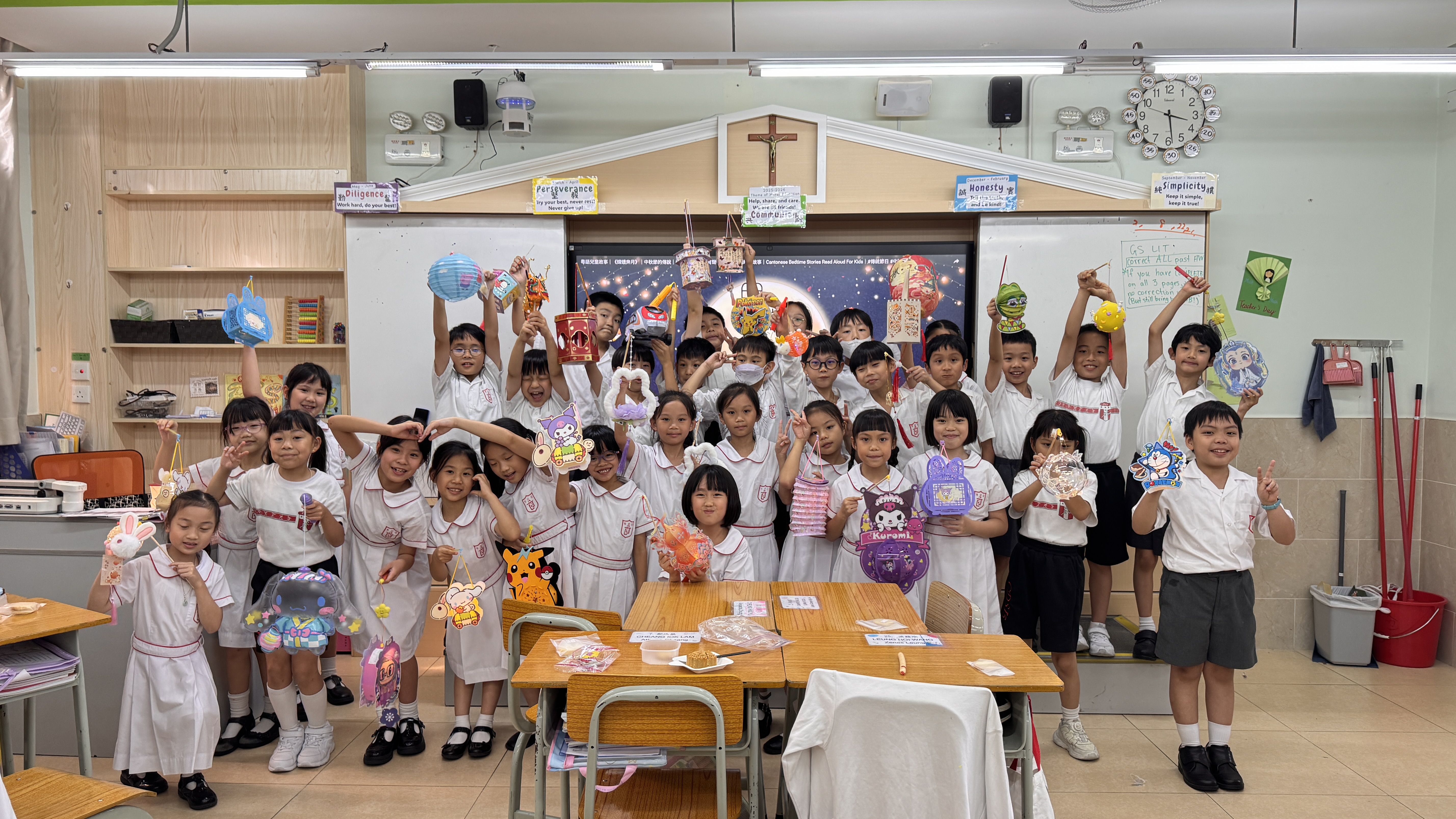 中秋節當天,P1-P3 在課室聽中秋故事、一同品嚐月餅與應節小食,互玩燈籠、合影留念,笑聲不斷;P4-P6 則以中文及英文燈謎互動切磋,猜中即可獲得同學精心準備的小禮物。同學們在歡樂中感受中華傳統文化,收穫難忘與充實!