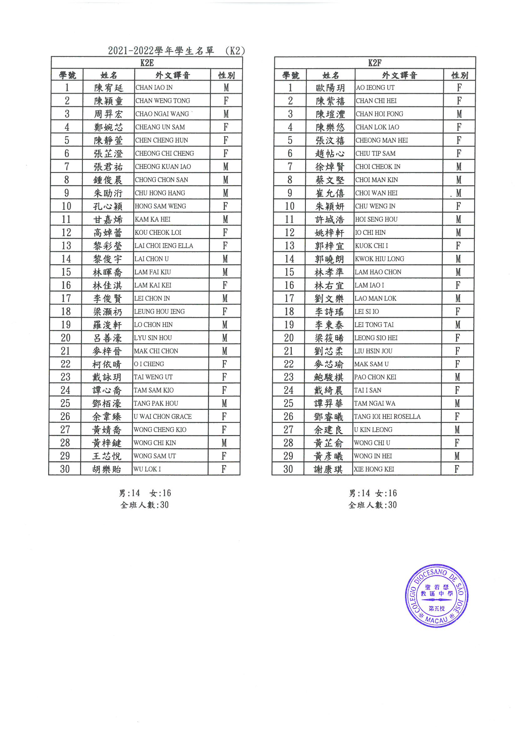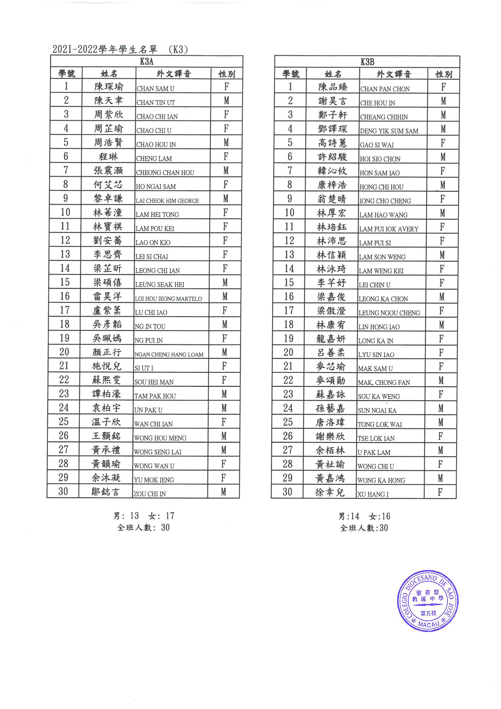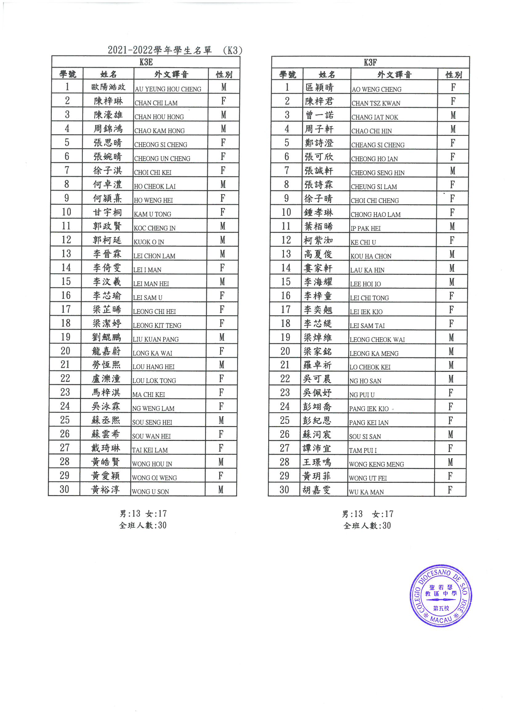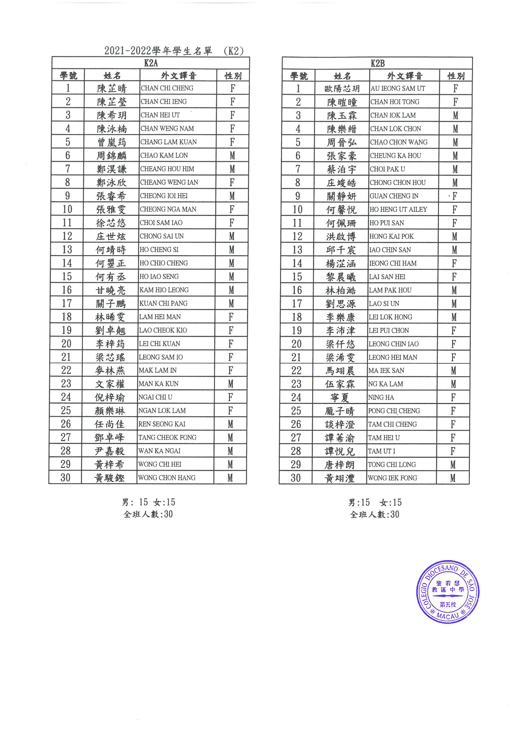 2021-2022 幼稚園K1-K3各班學生分班名單