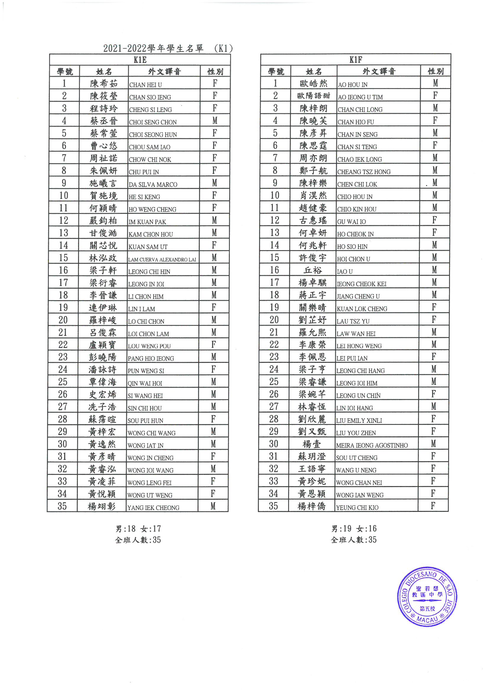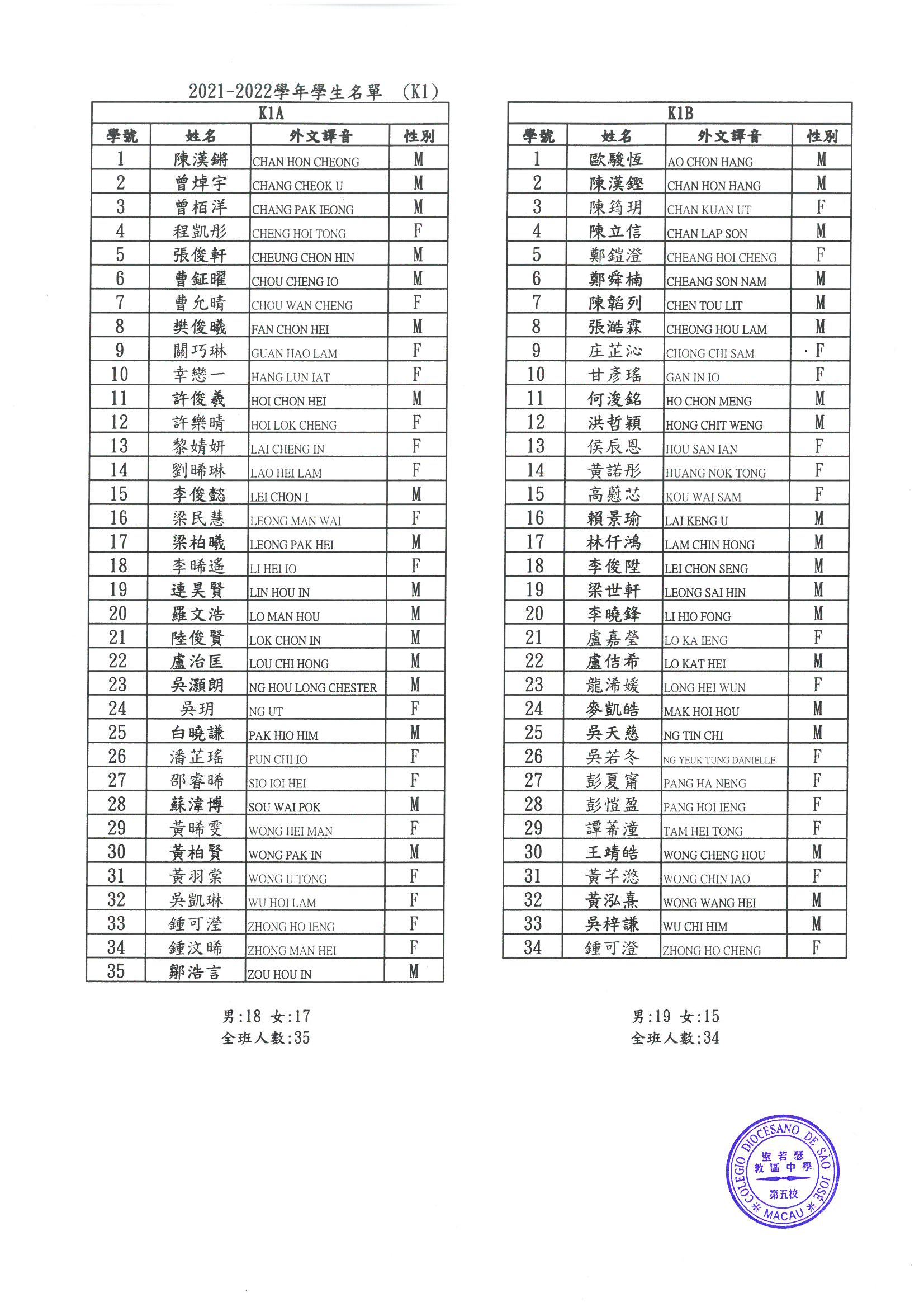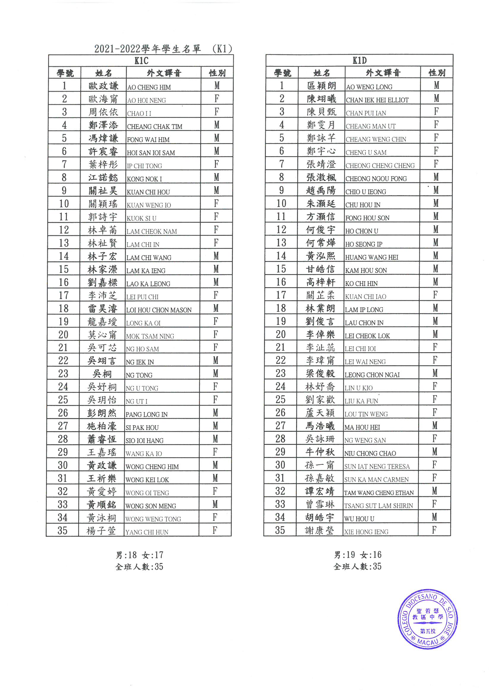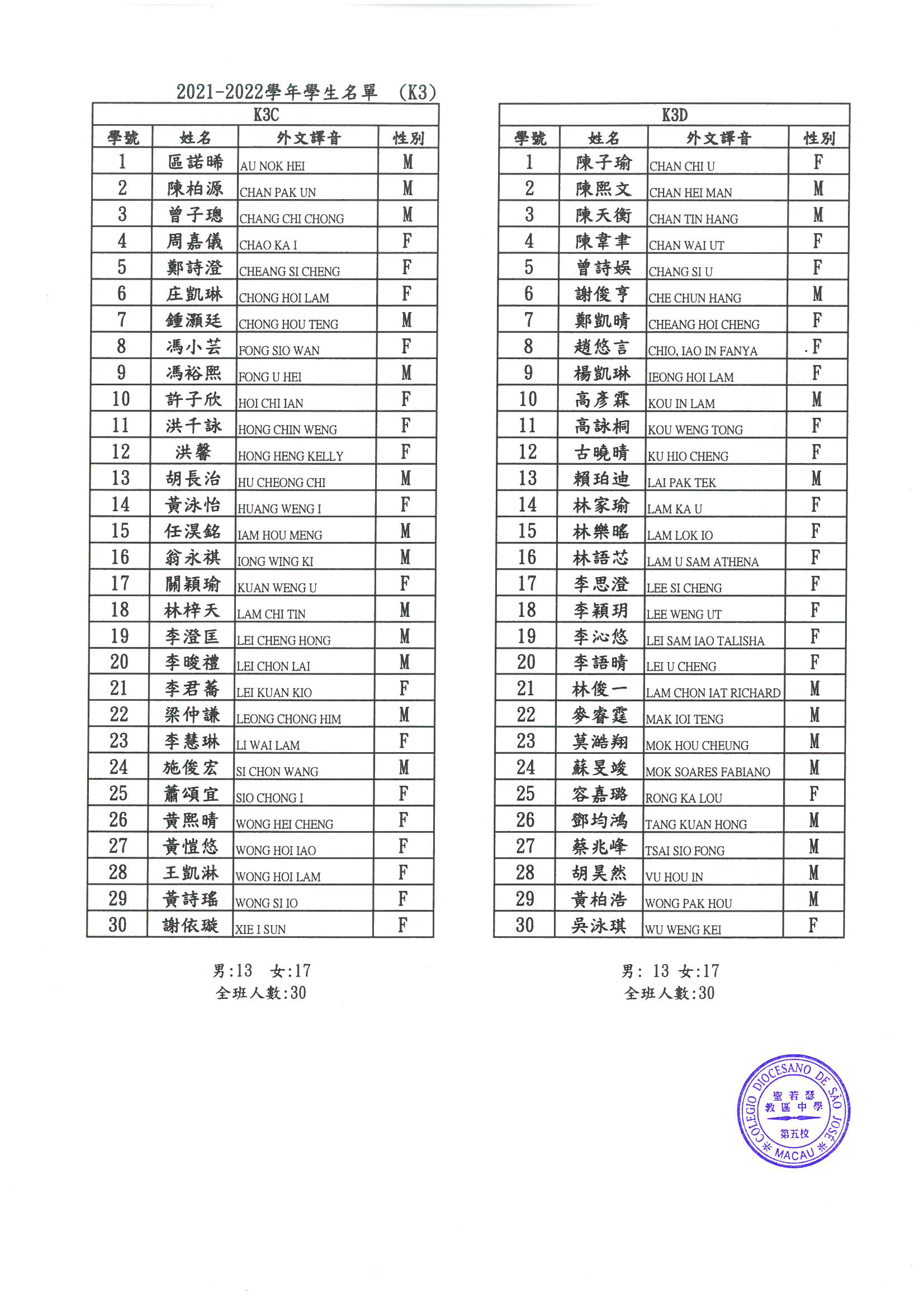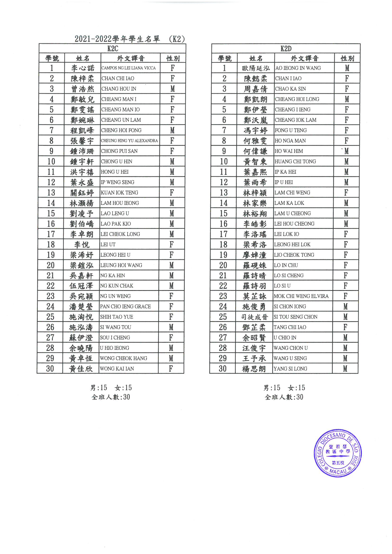 2021-2022 幼稚園K1-K3各班學生分班名單
