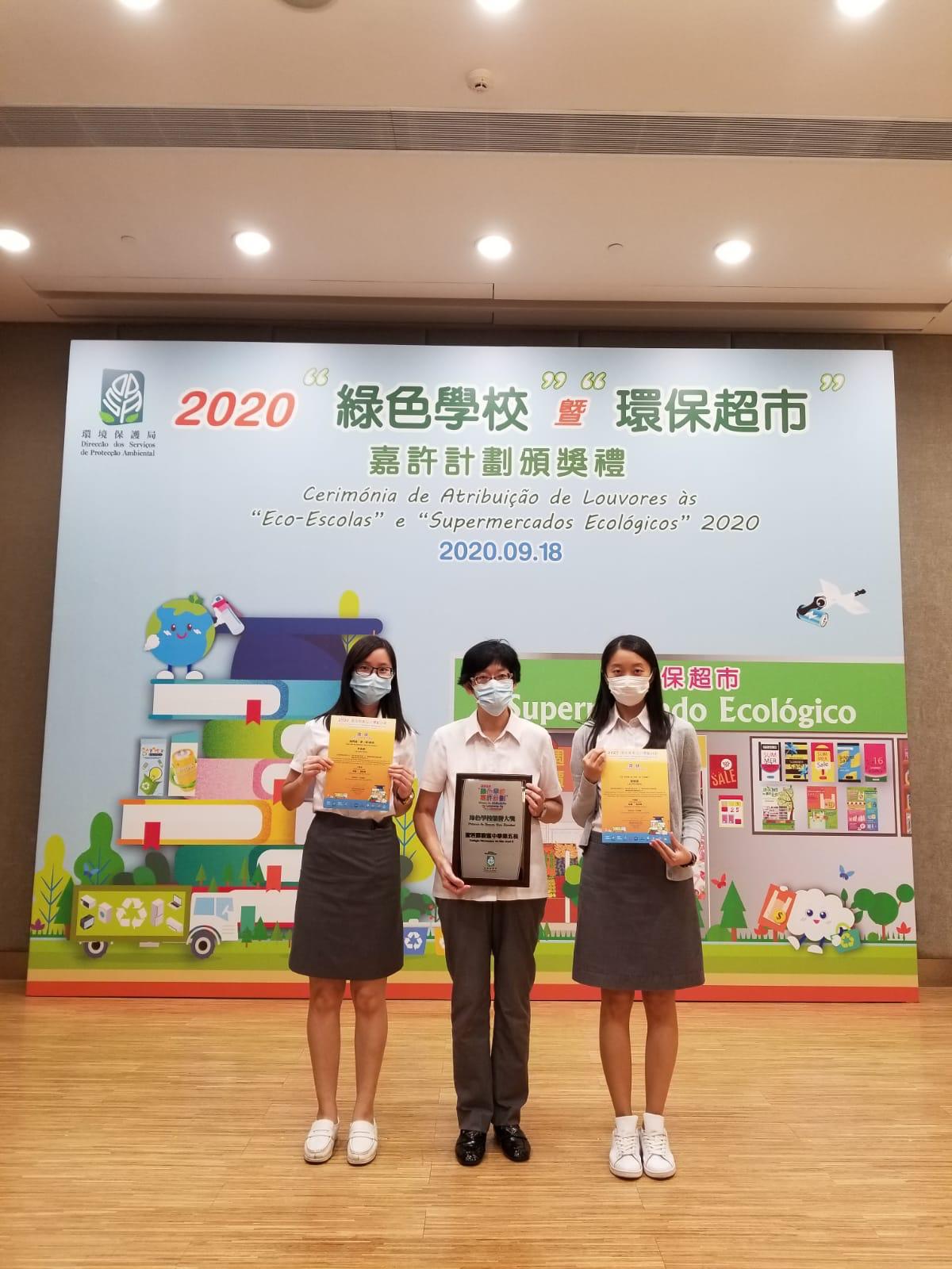 日前環保局於澳門科學館舉辦了2020「綠色學校活動」暨「環保超市」嘉許計劃頒奬禮,本校多名老師在活動中取得佳績,其中包括:中學中文部林鎮翔主任、霍征達老師及李盈盈老師,以及中學英文部嚴穎芝老師及劉碧穎老師均榮獲2020「環保教案設計奬勵計劃」中學組優秀奬;而本校亦獲得2020「綠色學校」榮譽大奬。