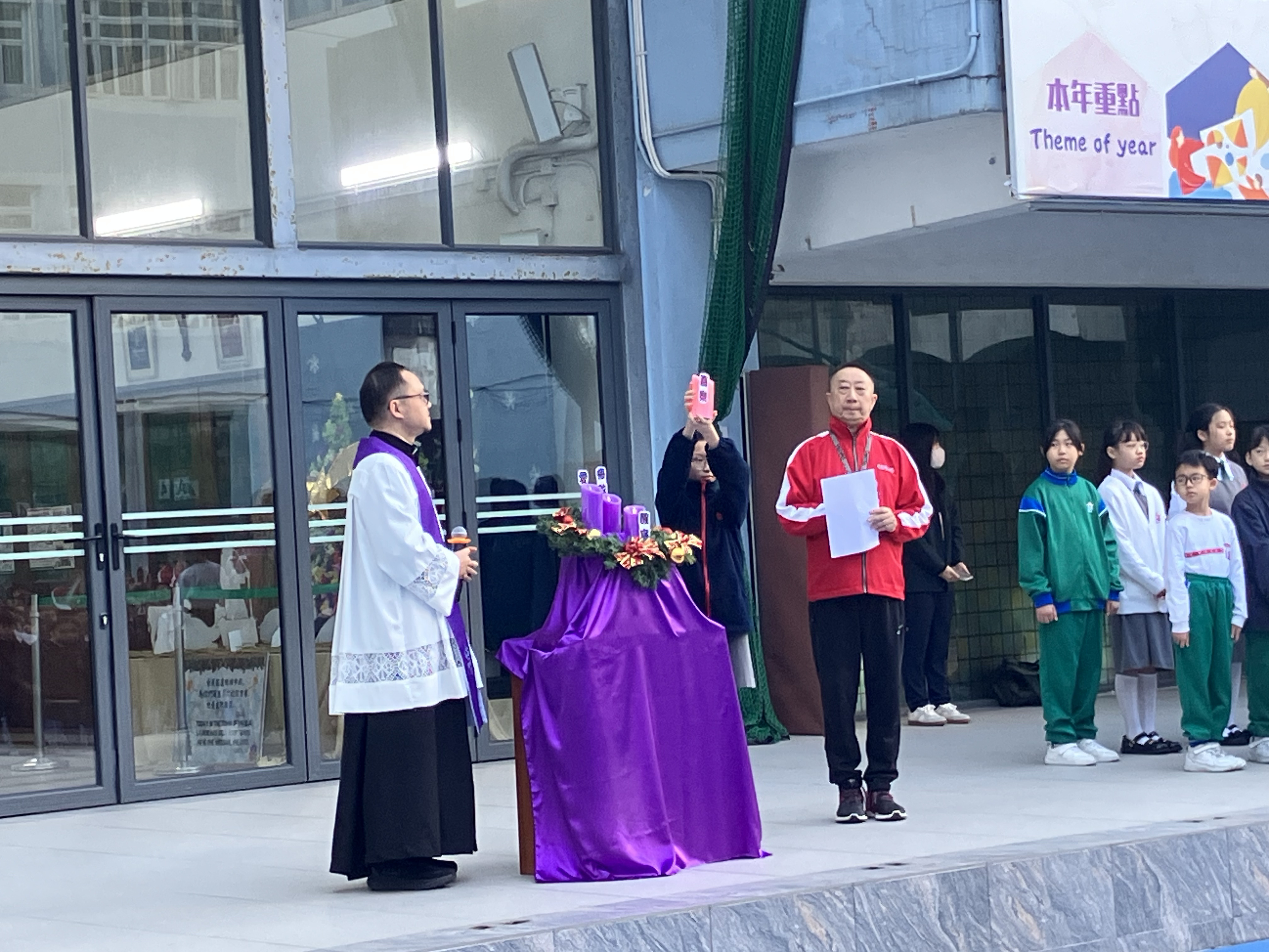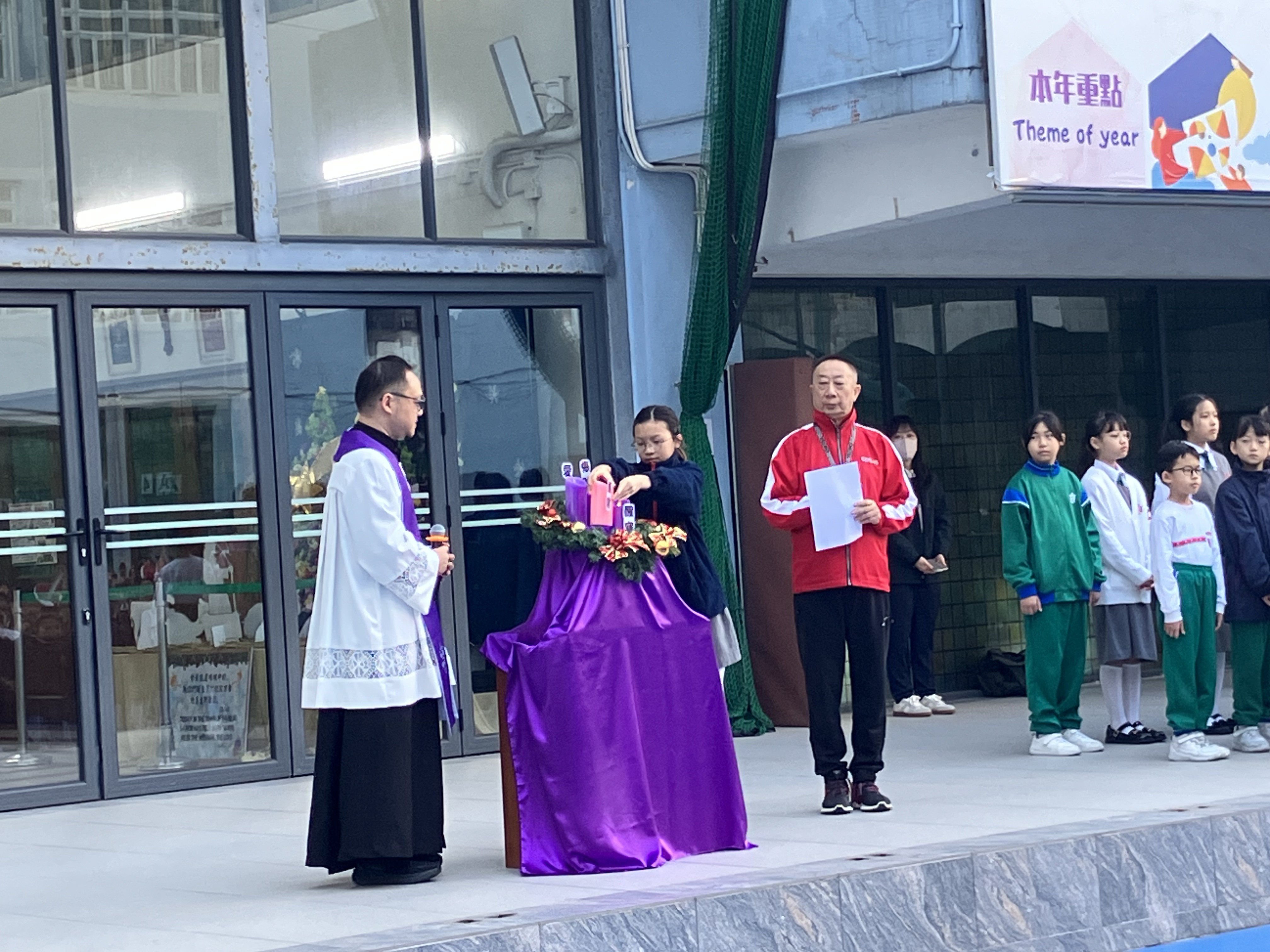 將臨期第三週的早會校牧張俊鍵神父為我們主持將臨環祝福禮,延續前兩週點燃「醒悟」與「悔改」兩支蠟燭後,本週我們迎來了第三支蠟燭——喜樂。