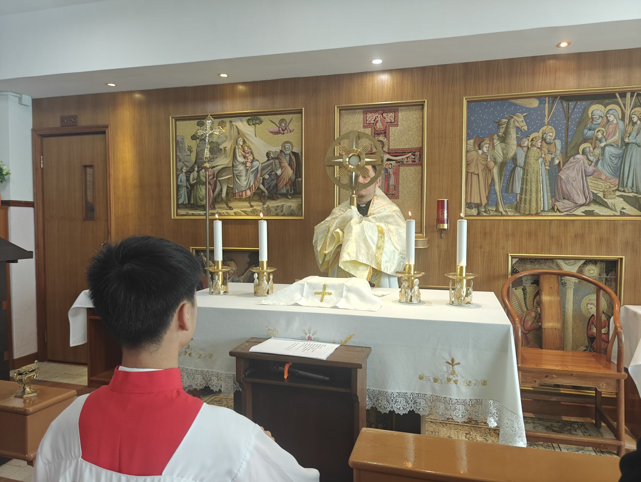 1月15日中午,校牧張俊鍵神父、眷顧修女與中學天主教同學會的同學齊聚於校內小聖堂進行聖體朝拜。張神父首先帶領眾人默想,並在恭讀福音後分享,提醒大家:祈禱應靜心聆聽天主的旨意,求主指引我們明確的方向。隨後,同學們一同誦念慈悲串經,懇求天主賜予耐心與智慧,使眾人明瞭盡心求學是本分,並能以平安的心與清晰的思緒面對各種挑戰。最後,全體在神父的帶領下領受聖體降福,為此次聚會畫下句點。